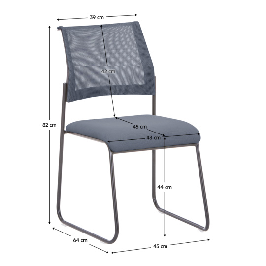 Materiál: síťovina/kov Oděruodolnost textilie podle testu Martindale: 90 000 oděrů Barva: šedá/černá Rozměry (ŠxHxV): 45x64x82 cm Výška sedu: 44 cm Hloubka sedu: 45 cm Šířka sedu: 43 cm Šířka zádové opěrky: 39 cm Výška zádové opěrky: 42 cm Nosnost: 100 kg Hmotnost: 4,45 kg Stohovatelná Zasedací Dodáváno v demontu