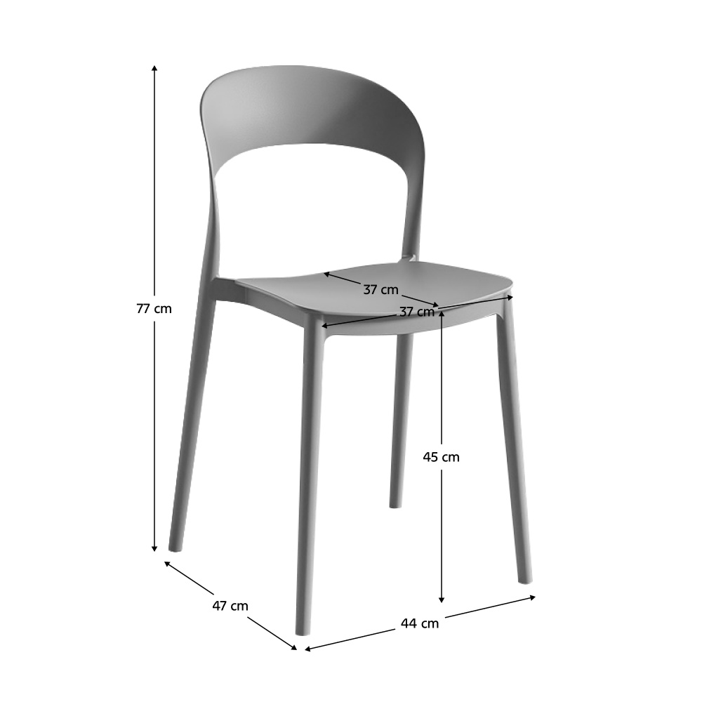 Materiál: plast Barva: šedá Rozměry (ŠxHxV): 44x47x77 cm Výška sedu: 45 cm Hloubka sedu: 37 cm Šířka sedu: 37 cm Stohovatelná S UV filtrem Vhodná do interiéru a exteriéru Nosnost: 100 kg Dodáváno v montě