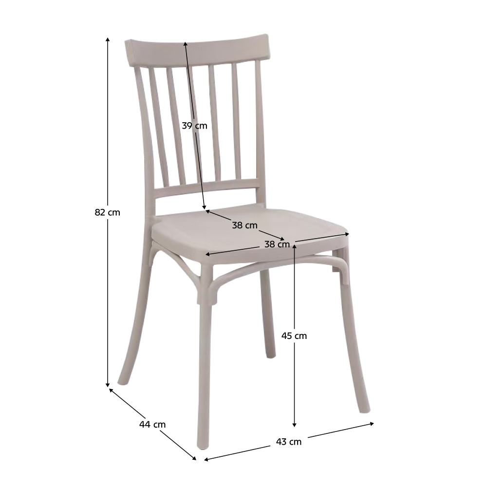 Materiál: plast Barva: šedohnědá Taupe kašmír Rozměry (ŠxHxV): 43x51x83 cm Výška sedu: 45 cm Hloubka sedu: 38 cm Šířka sedu: 38 cm Výška zad: 39 cm Stohovatelná S UV filtrem Vhodná do interiéru a exteriéru Nosnost: 100 kg Dodáváno v monte