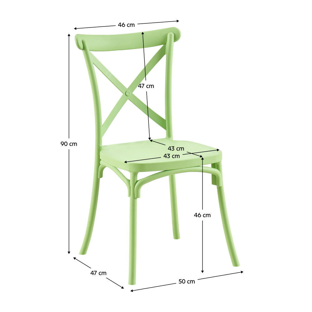Materiál: plast Barva: zelená Rozměry (ŠxHxV): 50x47x90 cm Výška sedu: 46 cm Hloubka sedu: 43 cm Šířka sezení: 43 cm Výška zad: 47 cm Šířka zad: 46 cm Nosnost: 100 kg Hmotnost: 4,25 kg Stohovatelná Vhodná do interiéru i exteriéru Dodáváno v monte