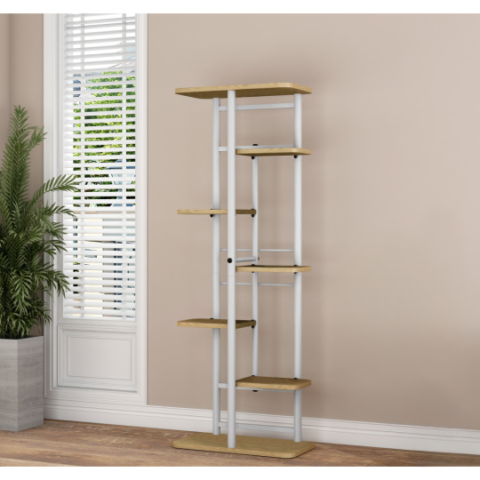 Materiál: kov/DTD Barva: bílá/dub sonoma Rozměry (ŠxHxV): 36x23,5x120 cm Šířka vrchní police: 30 cm Výška mezi 1 a 2 policí z levé strany: 39,5 cm Výška mezi 2 a 3 policí z levé strany: 34 cm Výška mezi 3 a 4 policí z levé strany: 42,5 cm Výška mezi 1 a 2 policí z pravé strany: 24 cm Výška mezi 2 a 3 policí z pravé strany: 31 cm Výška mezi 3 a 4 policí z pravé strany: 34 cm Výška mezi 4 a 5 policí z pravé strany: 26 cm Tloušťka tyče: 1,6 cm Nosnost na polici: 2 kg Doporučujeme rovnoměrné zatížení polic Jako stojan na hrnkové rostliny Praktický Víceúčelový Moderní design Dodáván v demontu