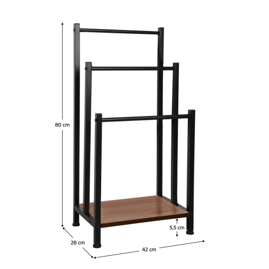Materiál: kov/MDF Barva: černá/přírodní Rozměry (ŠxHxV): 42x28x80 cm Třířadý Na nožičkách Výška od země po spodní část police: 5,5 cm K odkládání ručníků Spodní odkládací police Nosnost spodní police: 15 kg Dodáváno v demontu