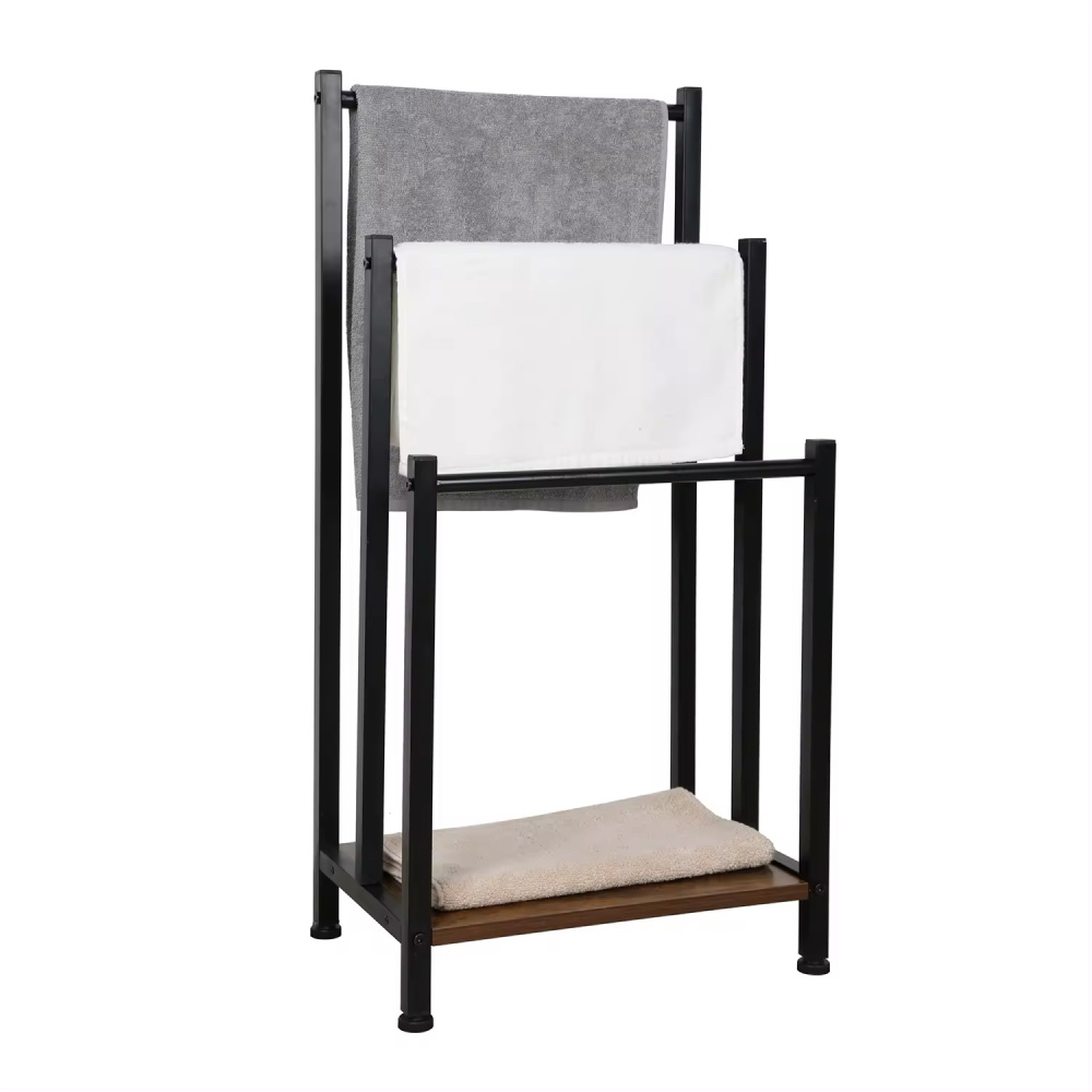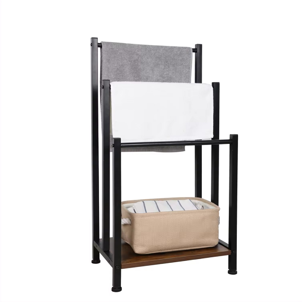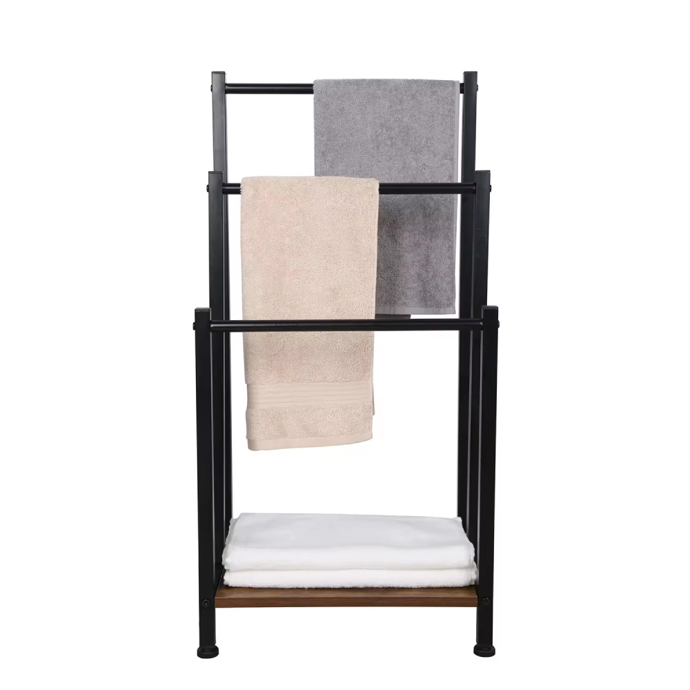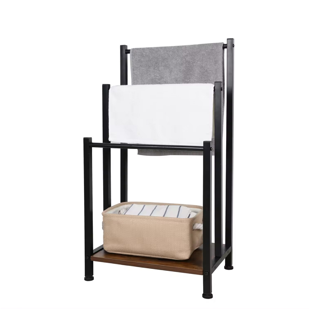 Materiál: kov/MDF Barva: černá/přírodní Rozměry (ŠxHxV): 42x28x80 cm Třířadý Na nožičkách Výška od země po spodní část police: 5,5 cm K odkládání ručníků Spodní odkládací police Nosnost spodní police: 15 kg Dodáváno v demontu