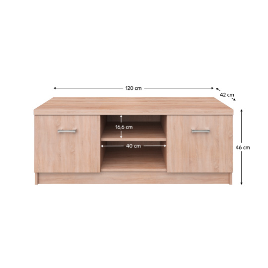 RTV Stolek 2D TOPTY TYP 35 Materiál: DTD laminovaná Barva: dub sonoma Rozměry (ŠxHxV): 120x42x46 cm Dvě skříňky Otevřený úložný prostor Dodáváno v demontu.