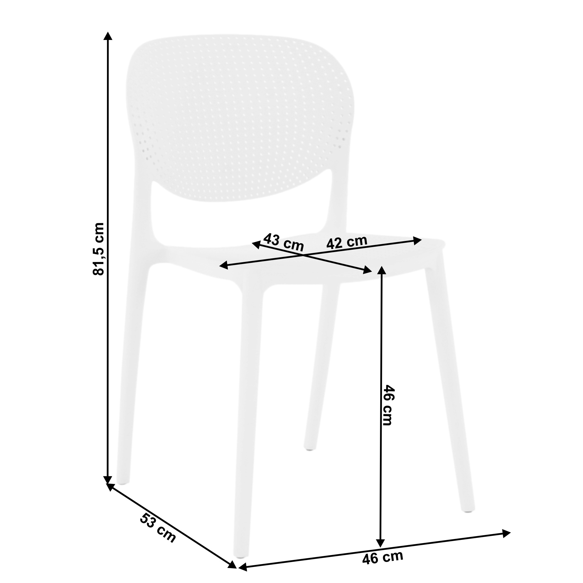 Materiál: plast Barva: bílá Rozměry (ŠxHxV): 46x53x81,5 cm Výška sedu: 46 cm Hloubka sedu: 43 cm Šířka sezení: 42 cm Nosnost: 90 kg Stohovatelná Vhodná do interiéru i exteriéru Dodáváno v monte