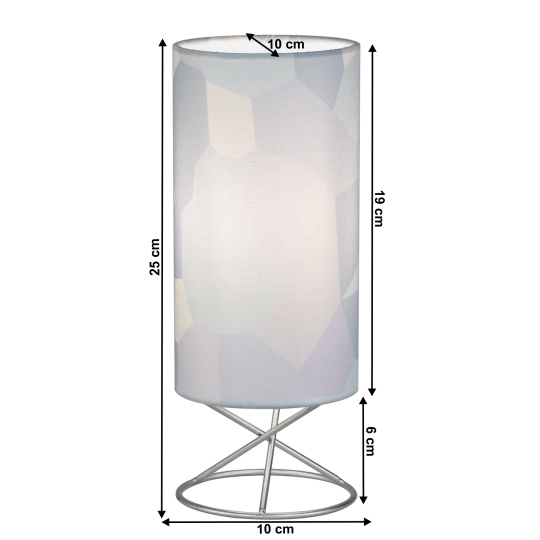 Stolní lampa AVAM Materiál: kov/textil Barva: šedá/vzor Celkové rozměry (ŠxHxV): 10x10x25 cm Rozměry podstavce (ŠxHxV): 10x10x6 cm Rozměry stínítka (ŠxHxV): 10x10x19 cm Dodávána bez žárovky Doporučený typ žárovky (závit): E14 Maximální příkon žárovky: 40 W Délka kabelu:1,3 m Hmotnost: 0,2 kg Napětí: 220-240 V Moderní design Dodávána v demontu