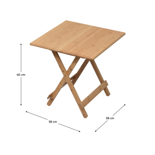 Materiál: bambus lakovaný Barva: přírodní Rozměry (ŠxHxV): 58x58x60 cm Nosnost: 100 kg Tloušťka plátu stolu: 1,8 cm Není vhodná do exteriéru Dá se složit Dodávané v monte
