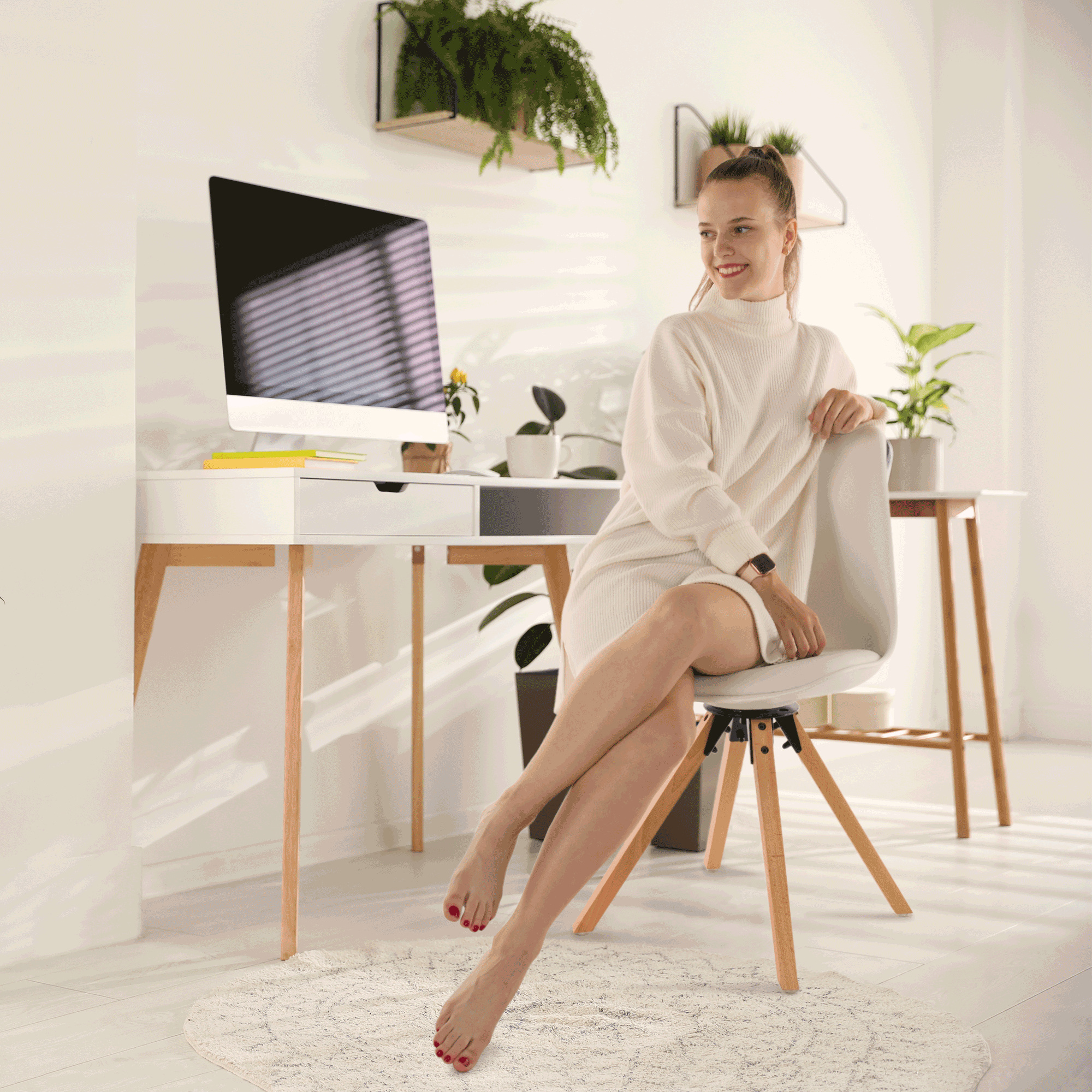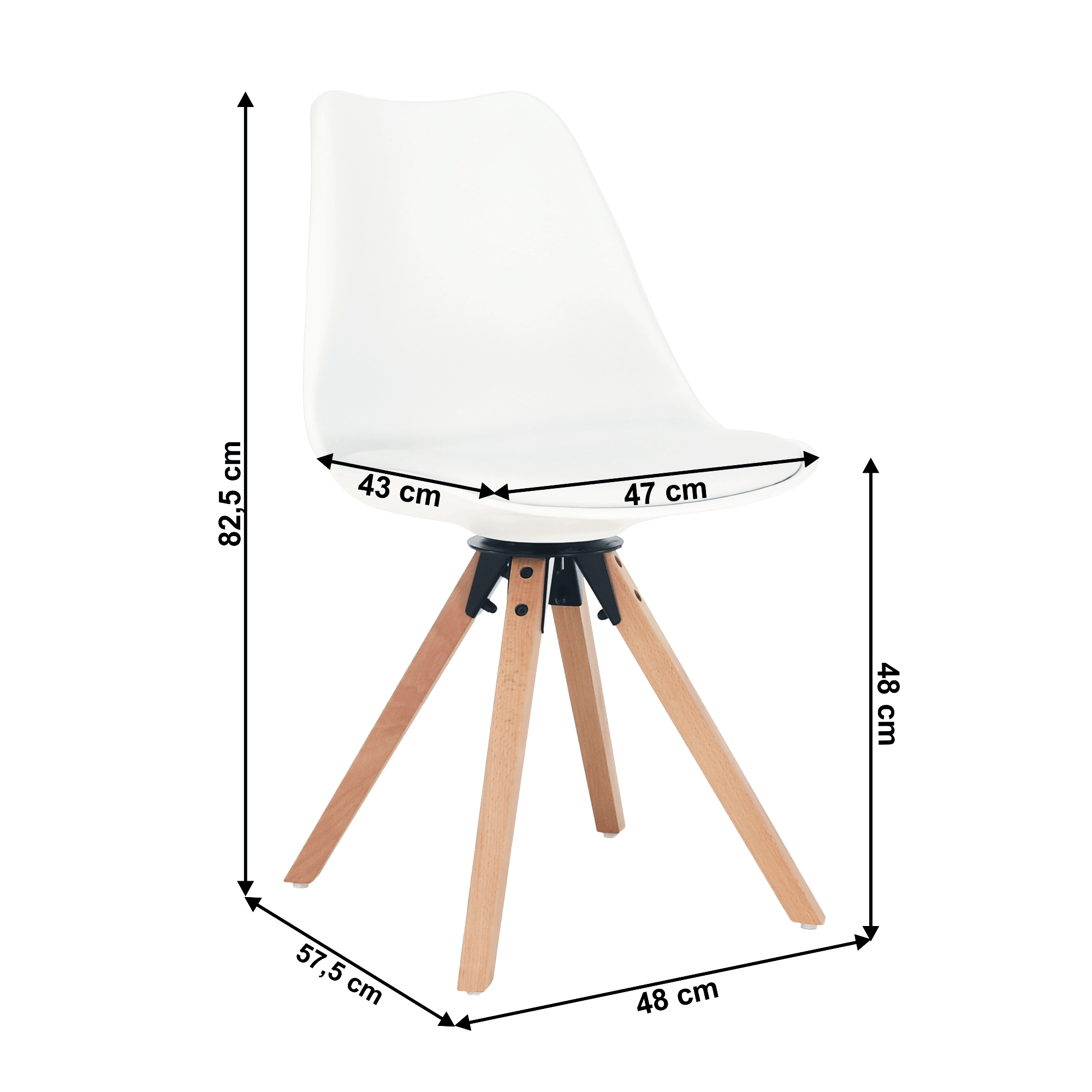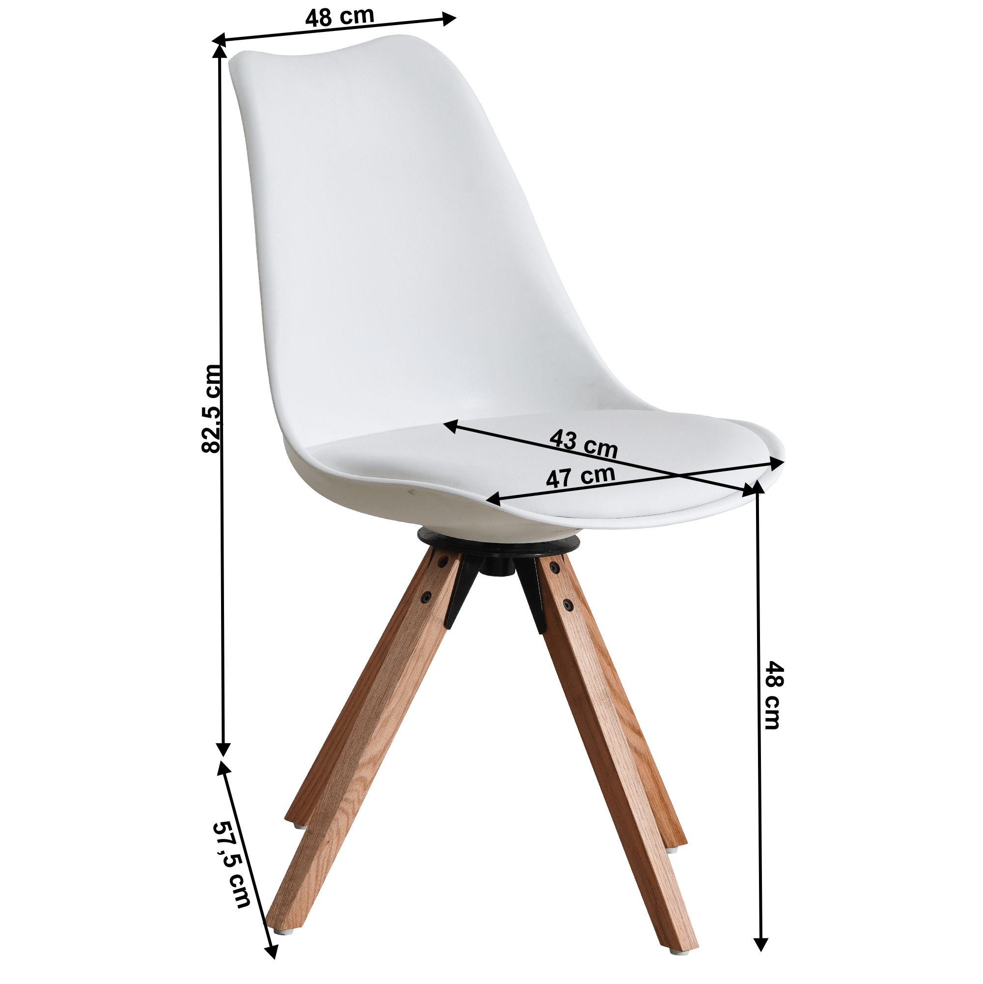 Materiál čalounění sedáku: ekokůže Barva: bílá Materiál konstrukce: plast Barva: bílá Materiál nohy: dřevo Barva: buk Oděruodolnost textilie podle testu Martindale: 100 000 oděrek Rozměry (ŠxHxV): 48x57,5x82,5 cm Šířka sezení: 47cm Hloubka sezení: 43 cm Výška sezení: 48 cm Nosnost: 100 kg otočná Až do 360 ° stupňů Dodávané v demontu