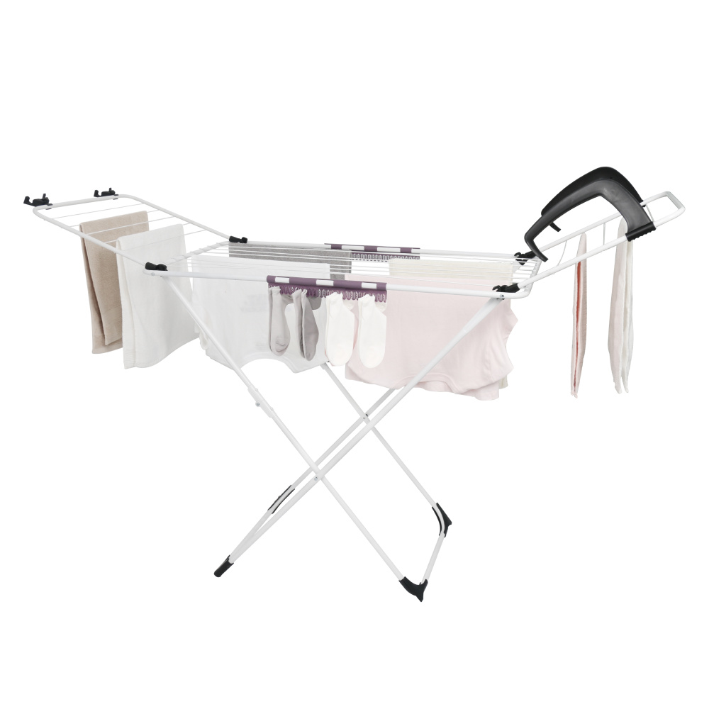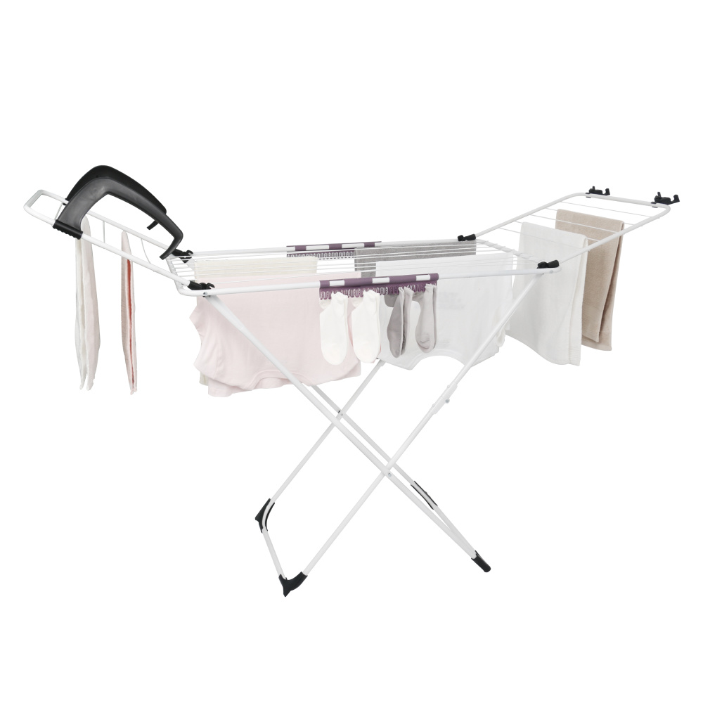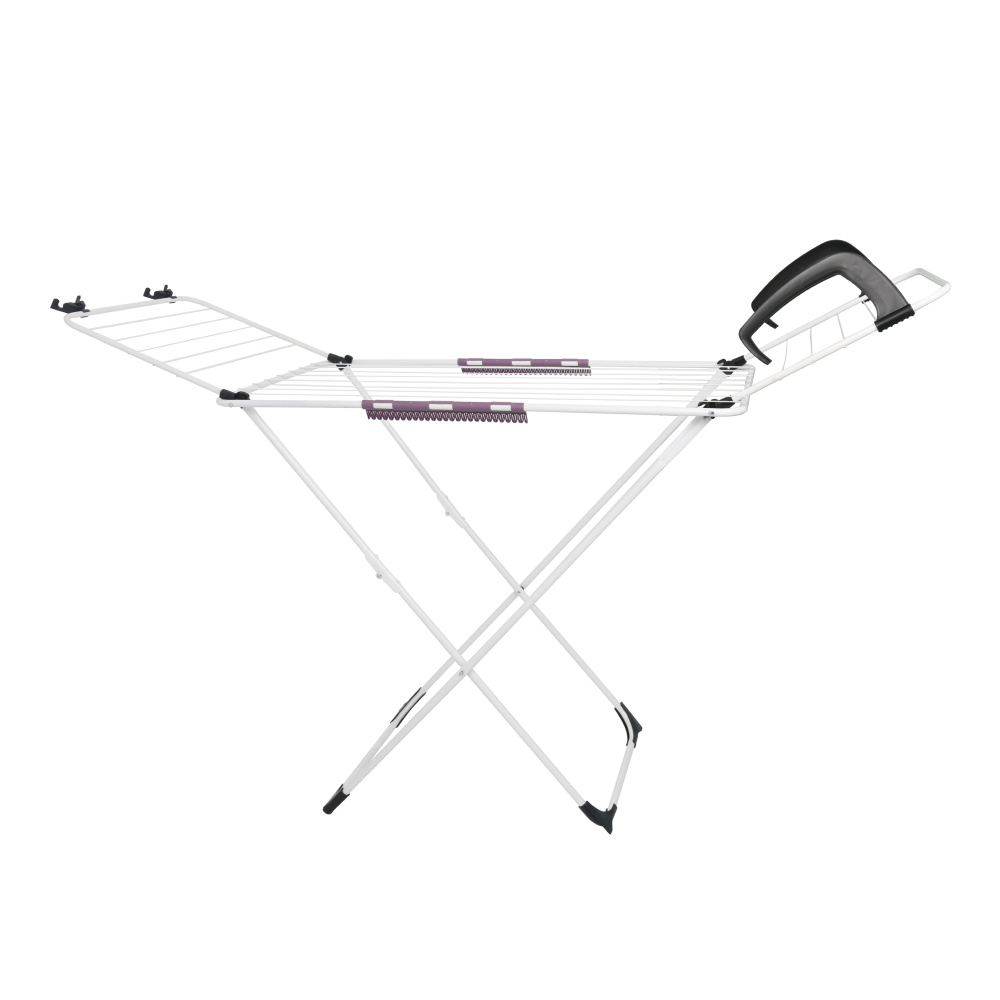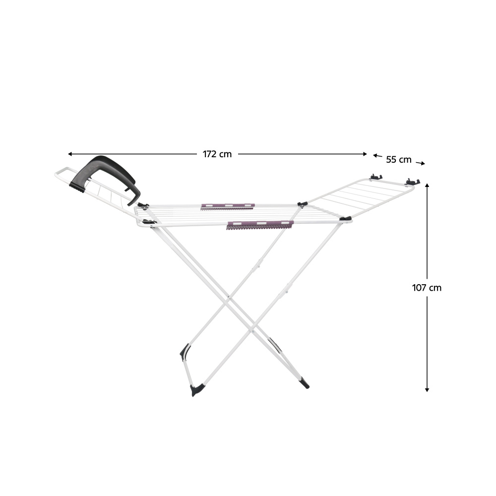 Materiál: kov Barva: bílá Rozměry (ŠxHxV): 172x55x107 cm Moderní design Rozkládací Stojící 2x easyclip na sušení drobného prádla Výklopná boční ramena Protiskluzové stabilizační kluzáky