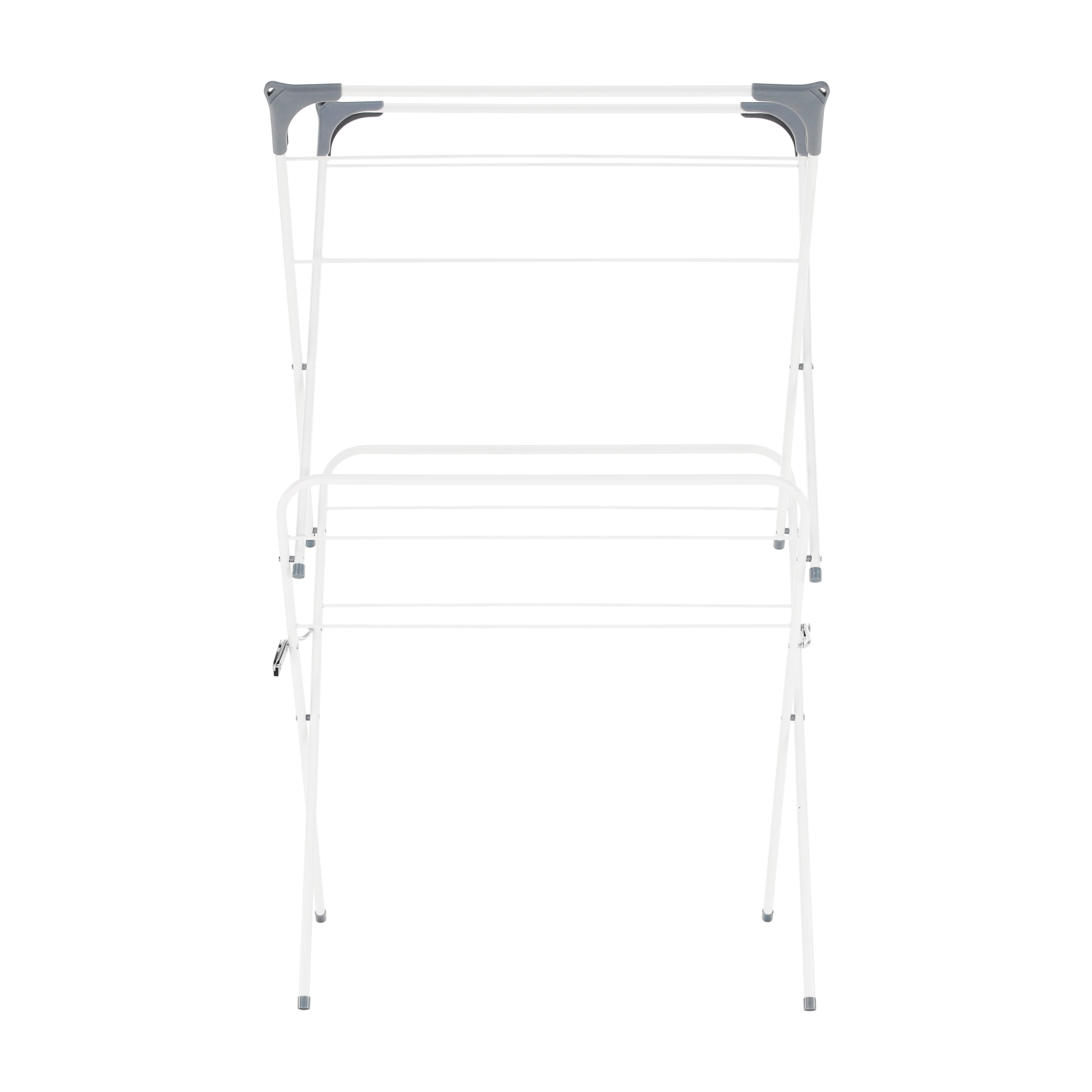 Materiál: kov Barva: bílá Rozměry (ŠxHxV): 172x55x107 cm Moderní design Rozkládací Stojící 2x easyclip na sušení drobného prádla Výklopná boční ramena Protiskluzové stabilizační kluzáky Hmotnost: 2.6kg