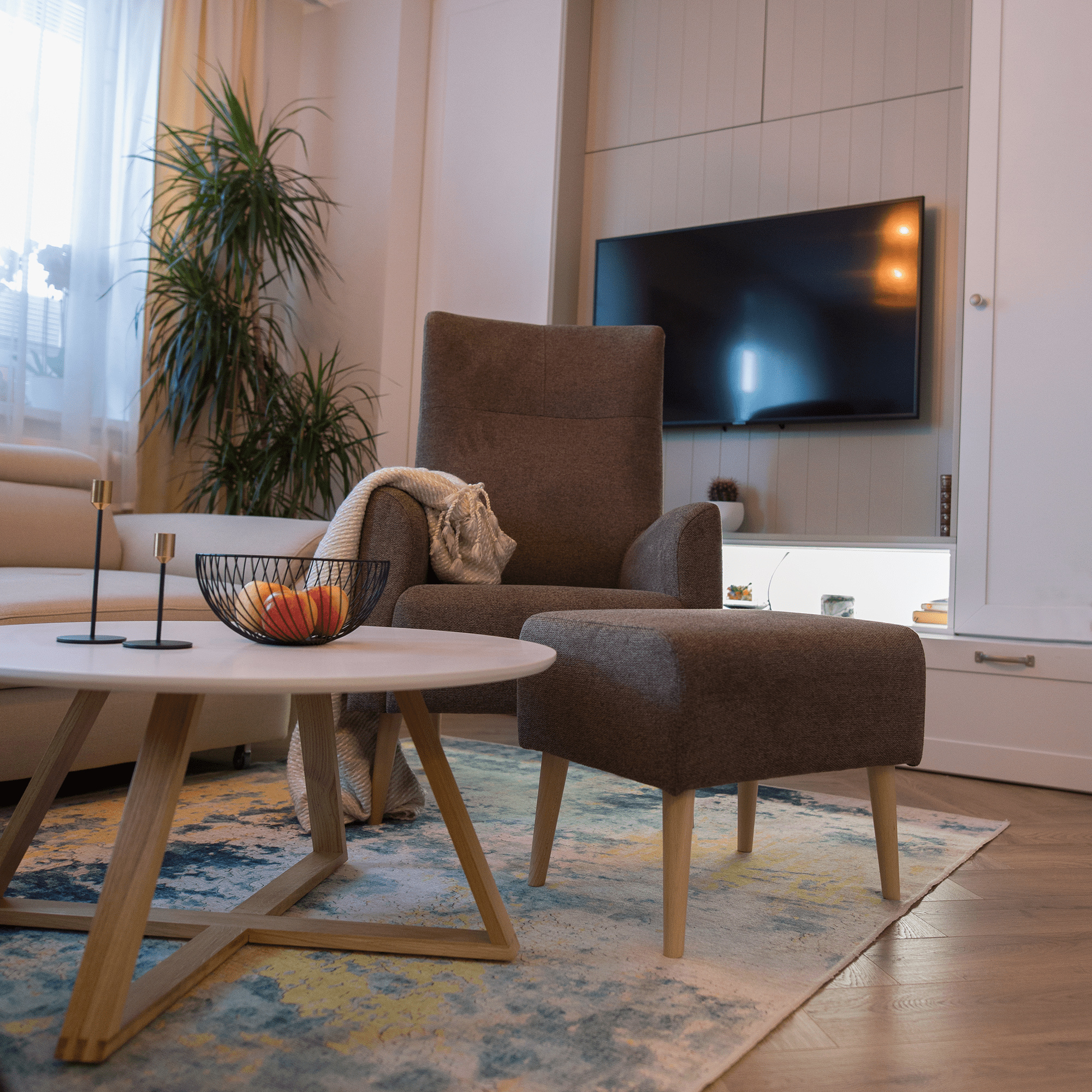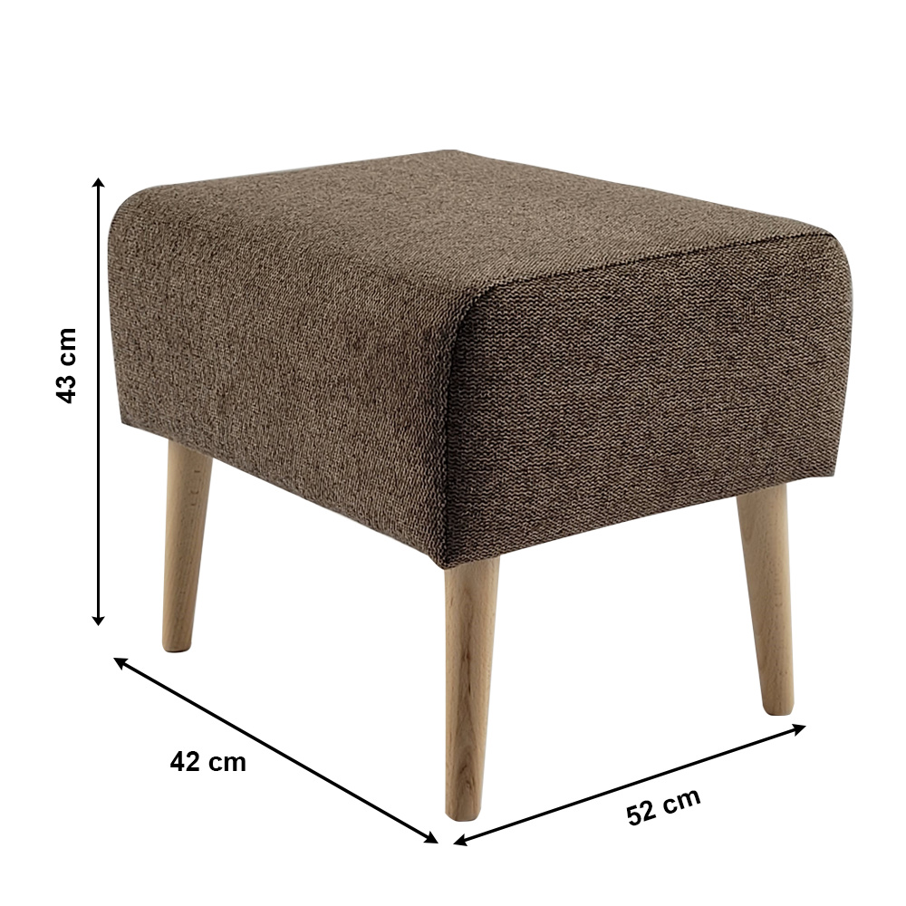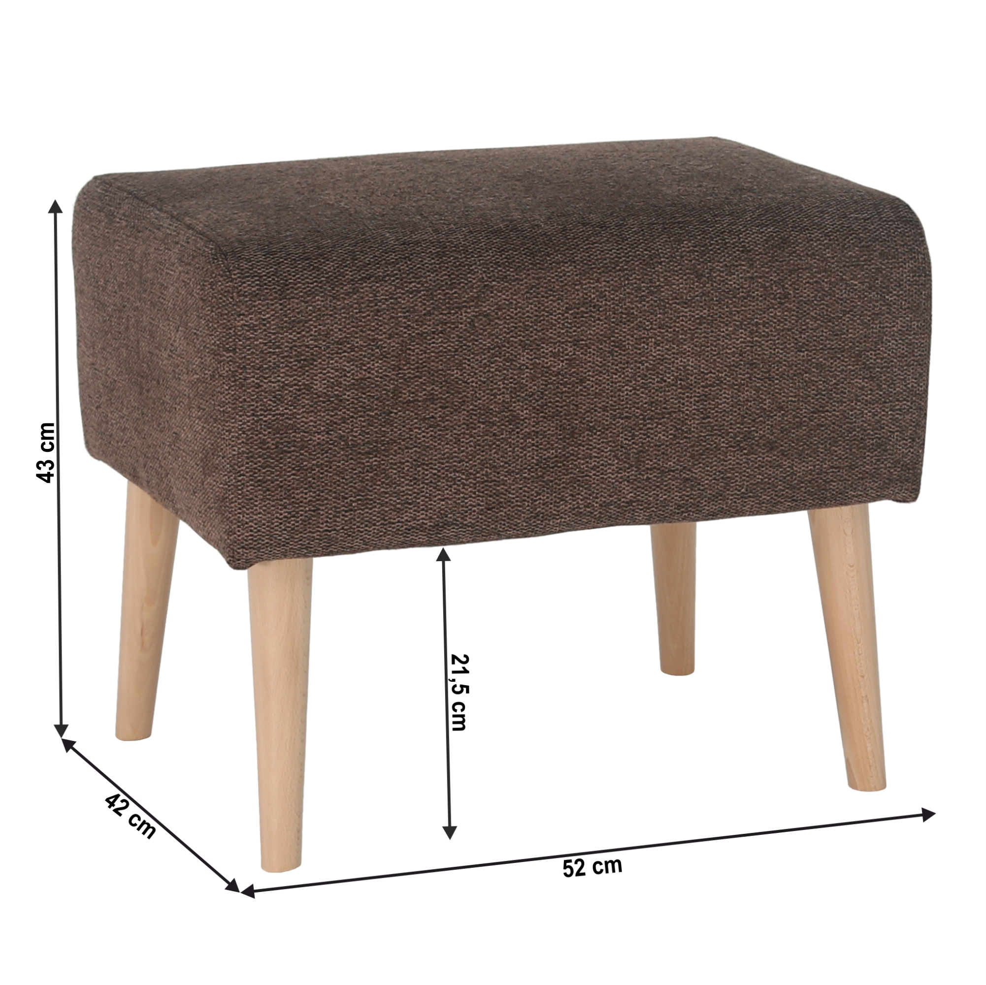 Materiál čalounění: látka Matana 19 Oděruodolnost textilie podle testu Martindale: 57 000 Barva čalounění: hnědá Materiál nohy: dřevo Barva nohy: buk Rozměry (ŠxHxV): 52x42x43 cm Nosnost na osobu: 90 kg Hmotnost: 7 kg Výška spodního prostoru od podlahy: 21,5 cm Elegantní a luxusní design Celočalouněný Dodáváno v monte