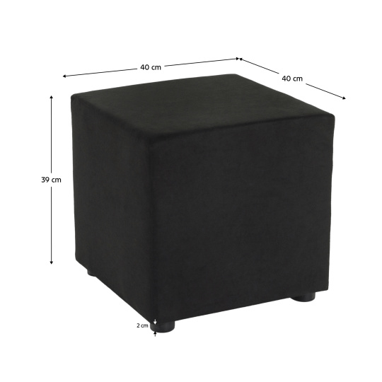 Materiál: látka Alova 04 Barevné provedení: černá Oděruodolnost textilie podle testu Martindale: 65 000 oděrů Jádro taburetu: dřevotříska/pur pěna Rozměry (ŠxHxV): 40x40x39 cm Výška sedu: 39 cm Hloubka sedu: 40 cm Nosnost: 100 kg S plastovými nožičkami Výška nožiček: 2 cm Hmotnost: 2 kg Dodáváno v monte
