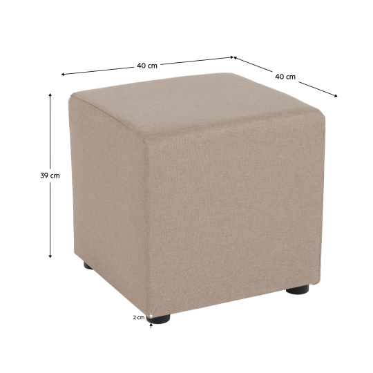 Materiál: látka Savana 17 Barevné provedení: béžová Oděruodolnost textilie podle testu Martindale: 100 000 oděrů Jádro taburetu: dřevotříska/pur pěna Rozměry (ŠxHxV): 40x40x39 cm Výška sedu: 39 cm Hloubka sedu: 40 cm Nosnost: 100 kg S plastovými nožičkami Výška nožiček: 2 cm Hmotnost: 2 kg Dodáváno v monte