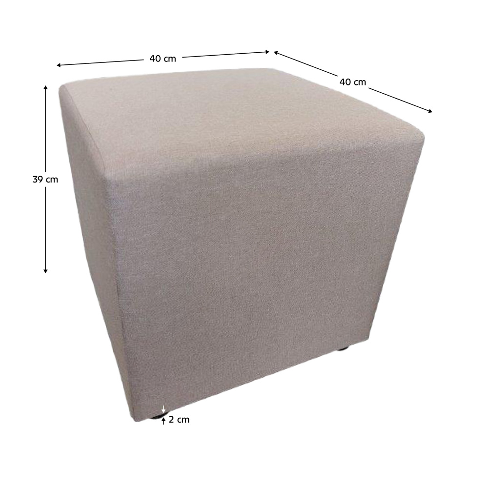 Materiál: látka Savana 17 Barevné provedení: béžová Oděruodolnost textilie podle testu Martindale: 100 000 oděrů Jádro taburetu: dřevotříska/pur pěna Rozměry (ŠxHxV): 40x40x39 cm Výška sedu: 39 cm Hloubka sedu: 40 cm Nosnost: 100 kg S plastovými nožičkami Výška nožiček: 2 cm Hmotnost: 2 kg Dodáváno v monte