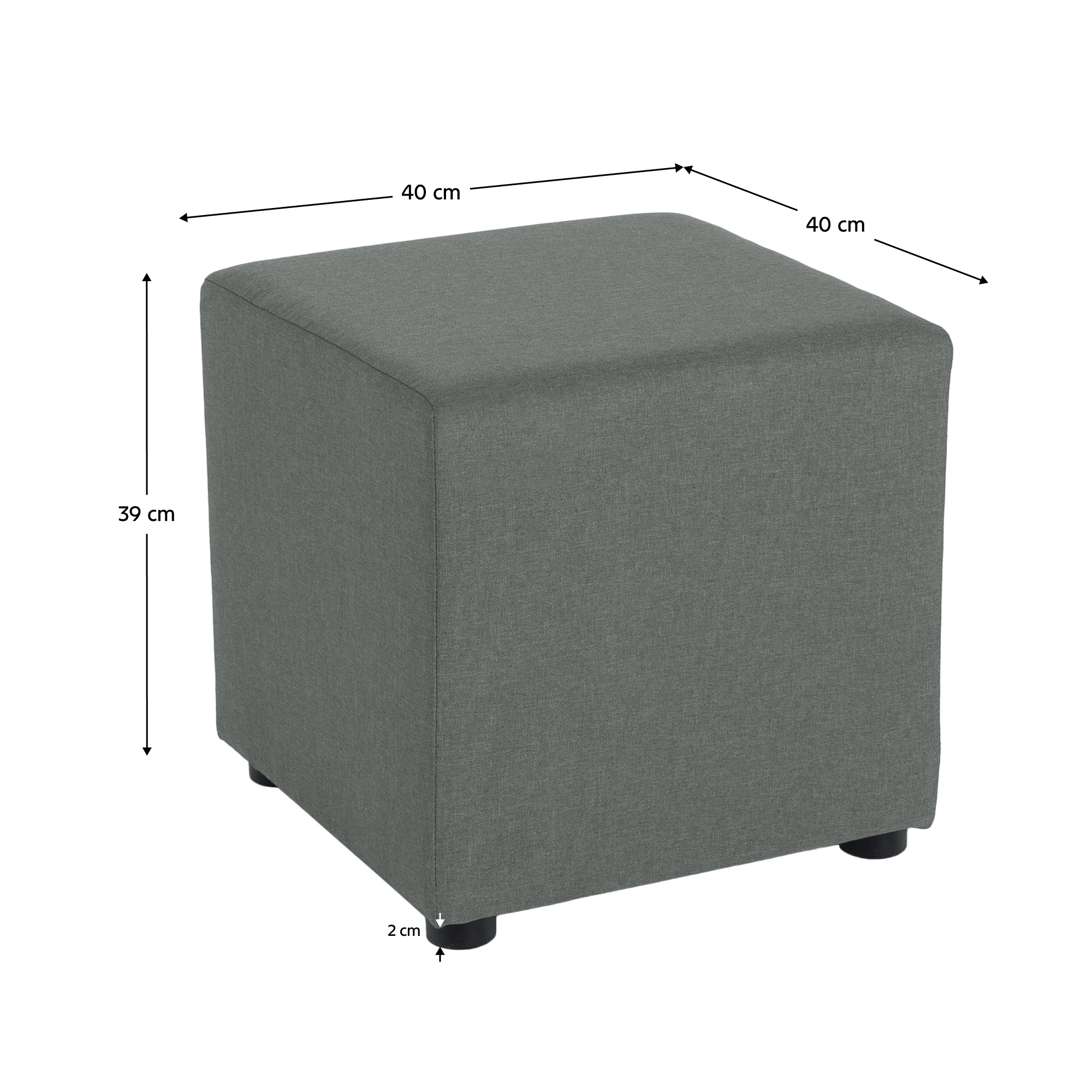 ateriál: látka Savana 34 Barevné provedení: zelená Oděruodolnost textilie podle testu Martindale: 100 000 oděrů Jádro taburetu: dřevotříska/pur pěna Rozměry (ŠxHxV): 40x40x39 cm Výška sedu: 39 cm Hloubka sedu: 40 cm Nosnost: 100 kg S plastovými nožičkami Výška nožiček: 2 cm Hmotnost: 2 kg Dodáváno v monte
