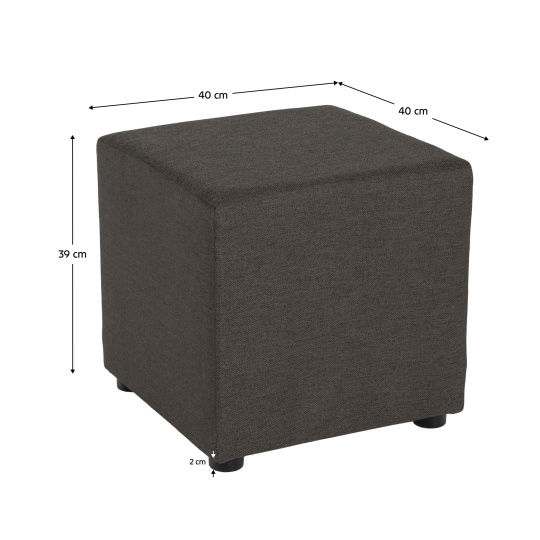 Materiál: látka Twist 22 Barevné provedení: šedohnědá Oděruodolnost textilie podle testu Martindale: 45 000 oděrů Jádro taburetu: dřevotříska/pur pěna Rozměry (ŠxHxV): 40x40x39 cm Výška sedu: 39 cm Hloubka sedu: 40 cm Nosnost: 100 kg S plastovými nožičkami Výška nožiček: 2 cm Hmotnost: 2 kg Dodáváno v monte