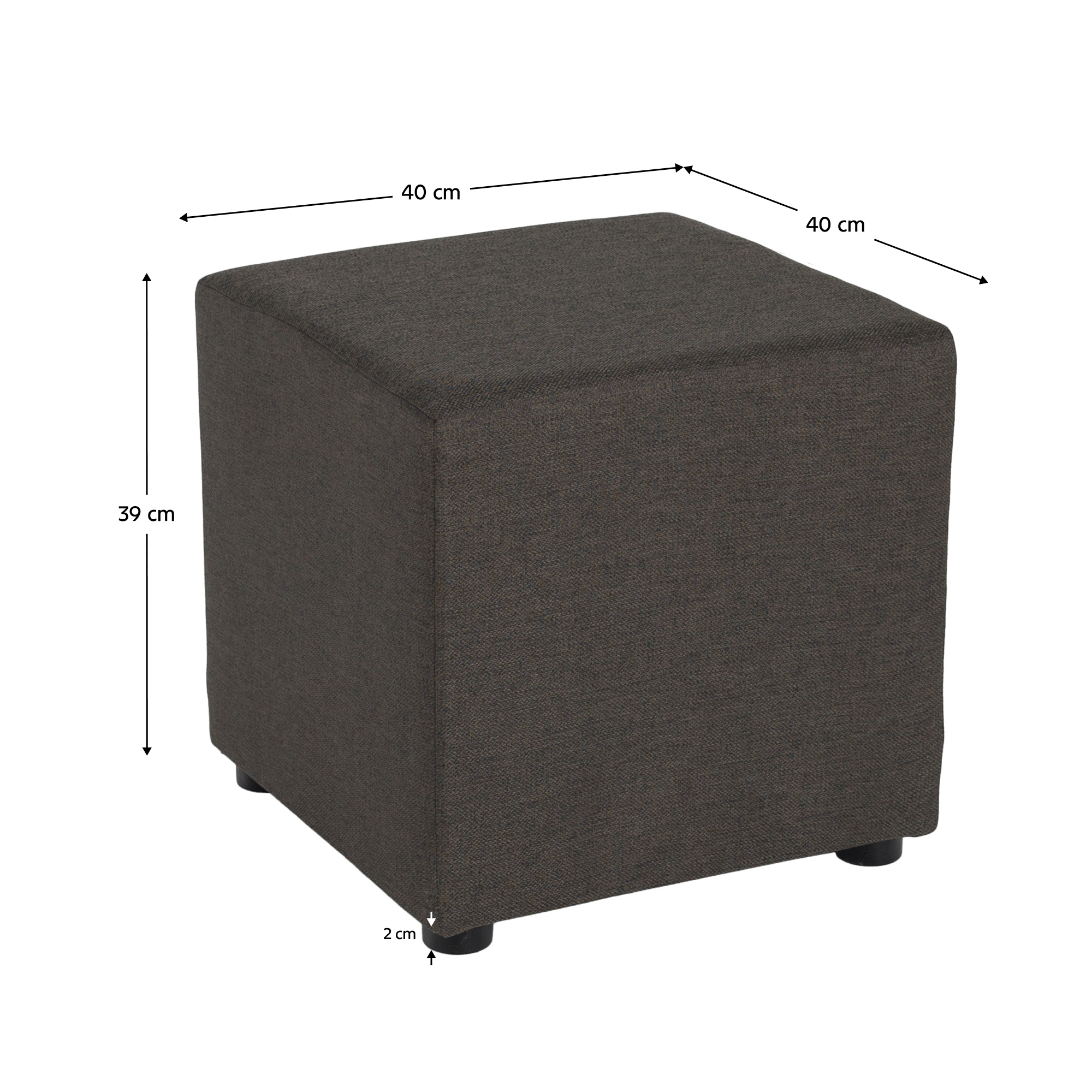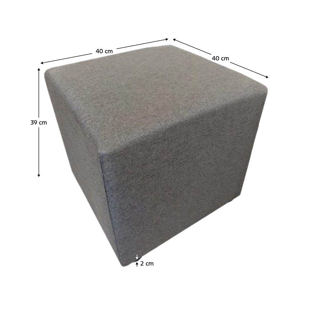 Materiál: látka Twist 22 Barevné provedení: šedohnědá Oděruodolnost textilie podle testu Martindale: 45 000 oděrů Jádro taburetu: dřevotříska/pur pěna Rozměry (ŠxHxV): 40x40x39 cm Výška sedu: 39 cm Hloubka sedu: 40 cm Nosnost: 100 kg S plastovými nožičkami Výška nožiček: 2 cm Hmotnost: 2 kg Dodáváno v monte