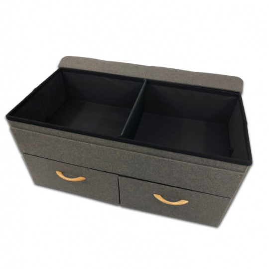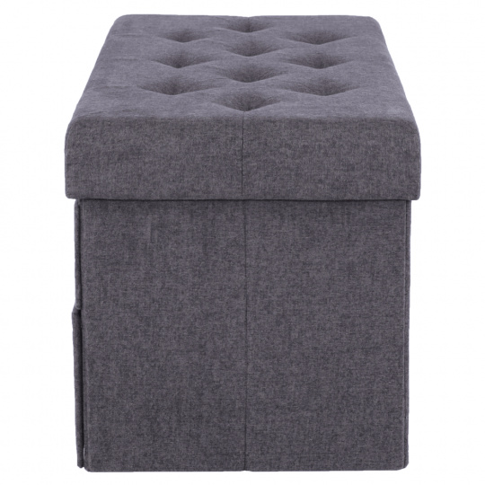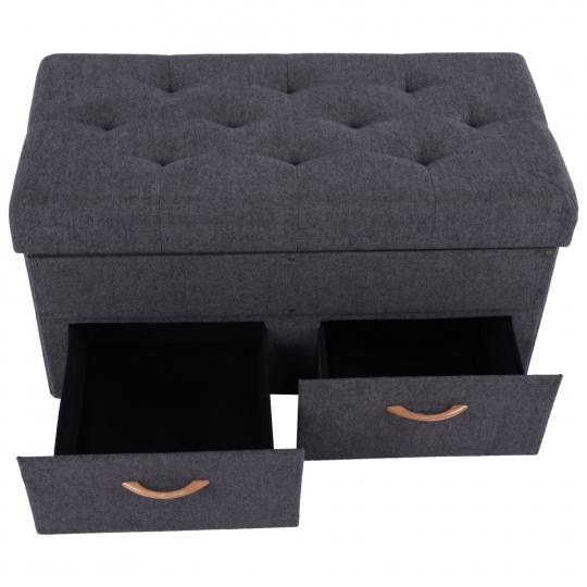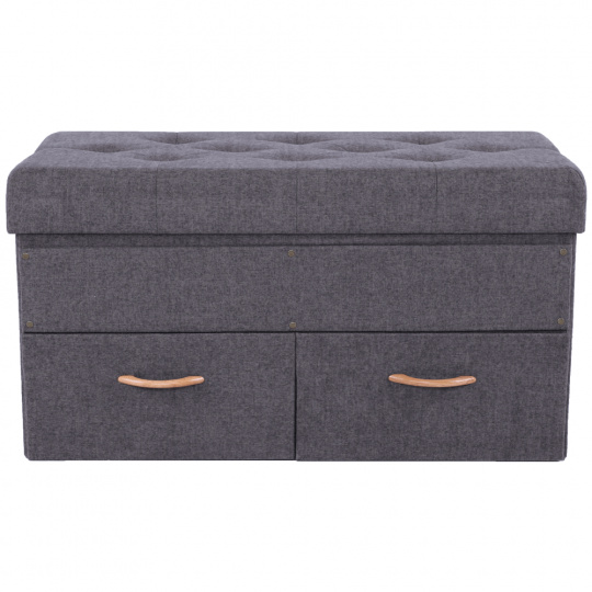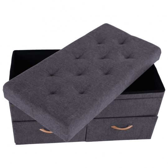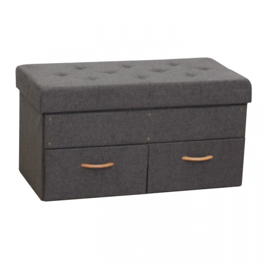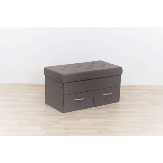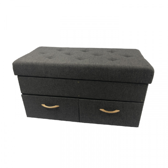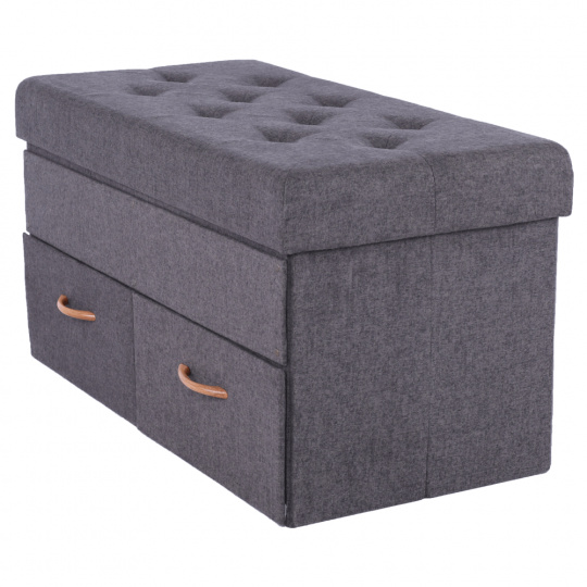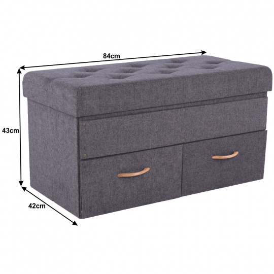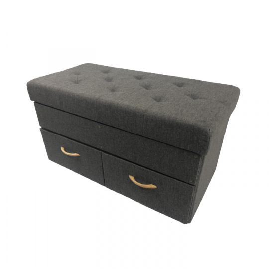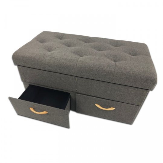 Prošívaný taburet Sulo TYP 2 Materiál: látka Oděruodolnost textilie podle testu Martindale: 90 000 oděrek Barva: šedá Rozměry ŠxHxV: 84x43x42 cm Hloubka sedu: 42 cm Výška sedu: 43 cm Úložný prostor se dvěma šuplíky. dodáváno v demontu.