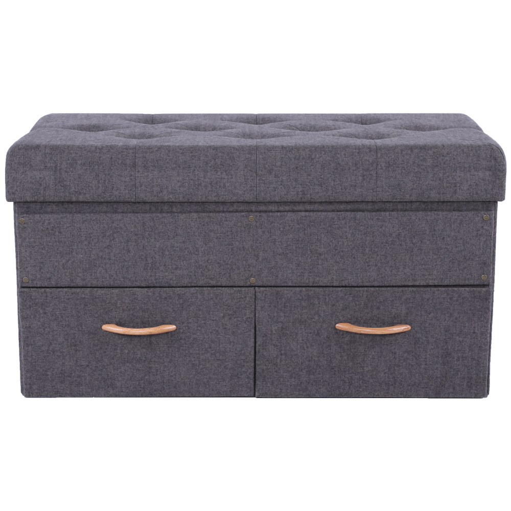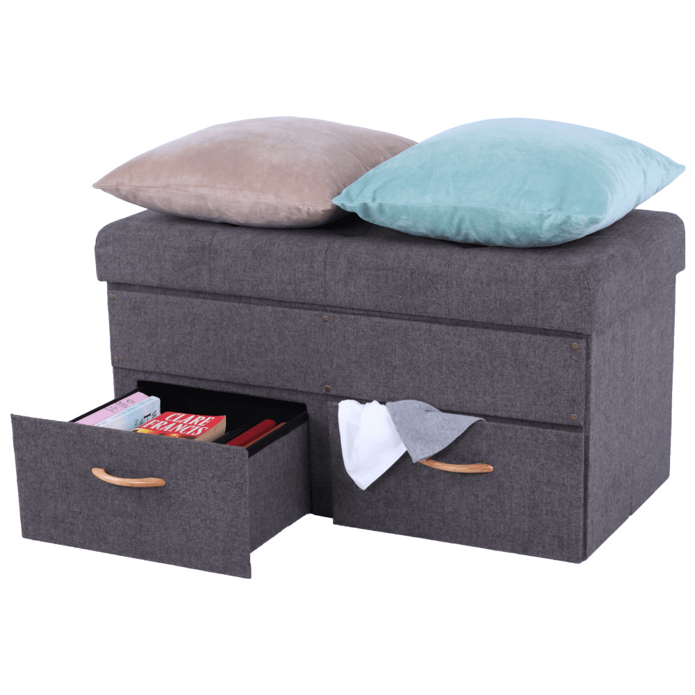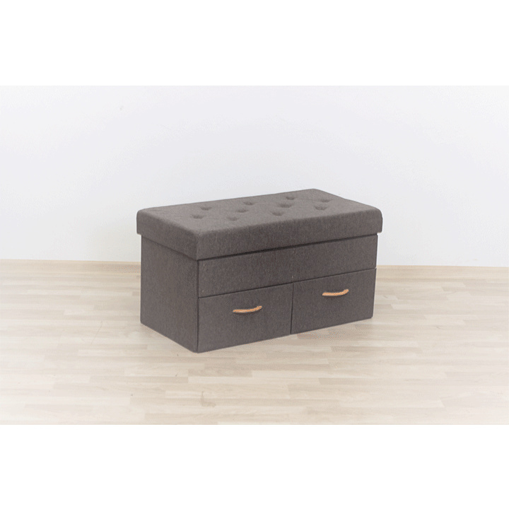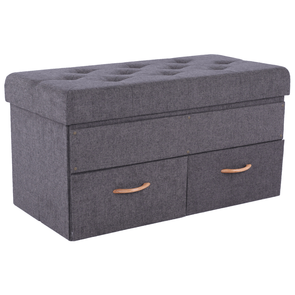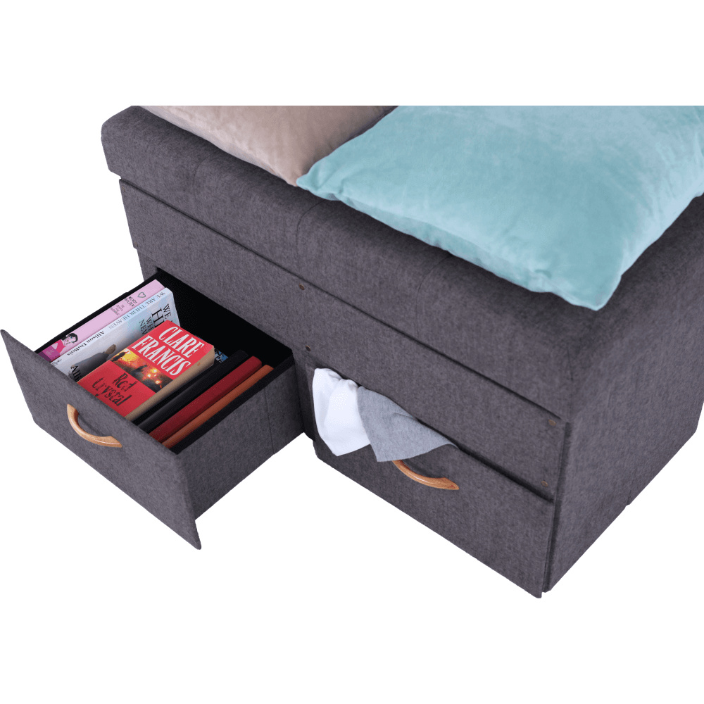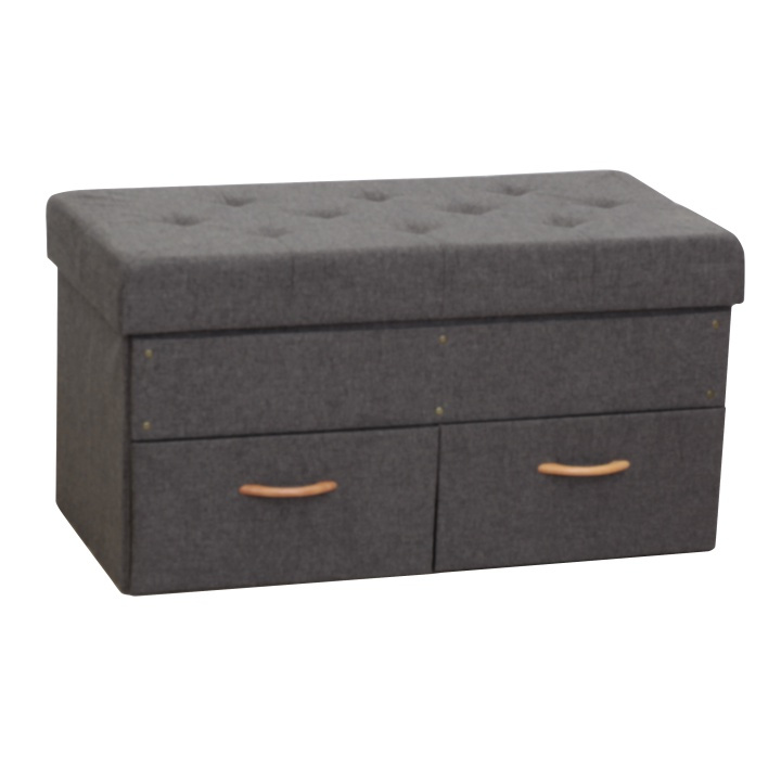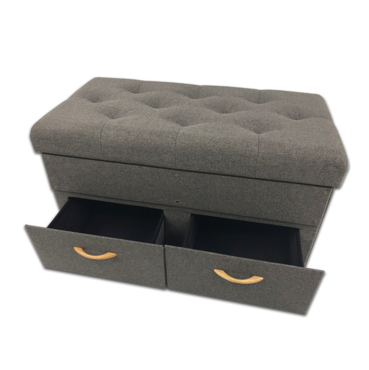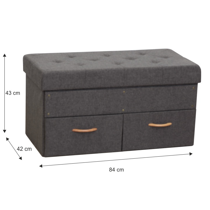 Prošívaný taburet Sulo TYP 2 Materiál: látka Oděruodolnost textilie podle testu Martindale: 90 000 oděrek Barva: šedá Rozměry ŠxHxV: 84x43x42 cm Hloubka sedu: 42 cm Výška sedu: 43 cm Úložný prostor se dvěma šuplíky. dodáváno v demontu.