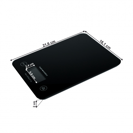 Materiál: temperované sklo Barva: černá Rozměr váhy (ŠxHxV): 21,6x16,1x2 cm Rozměry displeje (ŠxV): 5,8x2,4 cm Velikost číslic displeje: 5,6x2,2 cm Nutriční digitální váha Pro zobrazování nutričních hodnot je nutná mobilní aplikace Historie vážení a zaznamenávání naměřených údajů prostřednictvím aplikace Rozpoznávání potravin podle číselného kódu Váha obsahuje senzorová ovládaná tlačítka Funkce nulování a postupného dovážení Funkce měření objemu tekutin Volba hmotnostních jednotek: G, Kg, L LCD displej s bílým podsvícením Maximální zatížení: 5 kg Hmotnost: 0,4 kg Automatické vypnutí při nečinnosti Moderní design Napájení 2x1,5 V AAA baterie (jsou součástí výrobku) Obsahuje indikátor slabých baterií a indikátor přetížení váhy Dodáváno bez mobilního telefonu