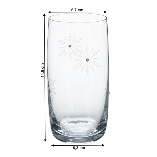 Set 4 ks sklenic na vodu Materiál: sklo Barva: čirá / bílá Rozměr (průměr x V): 6,7x14,6 cm Spodní průměr: 6,3 cm Objem poháru: 460 ml Hmotnost poháru: 225 g Vánoční design Zdobené vločkami s umělým diamantem Nevhodné do mikrovlnné trouby Nevhodné do myčky
