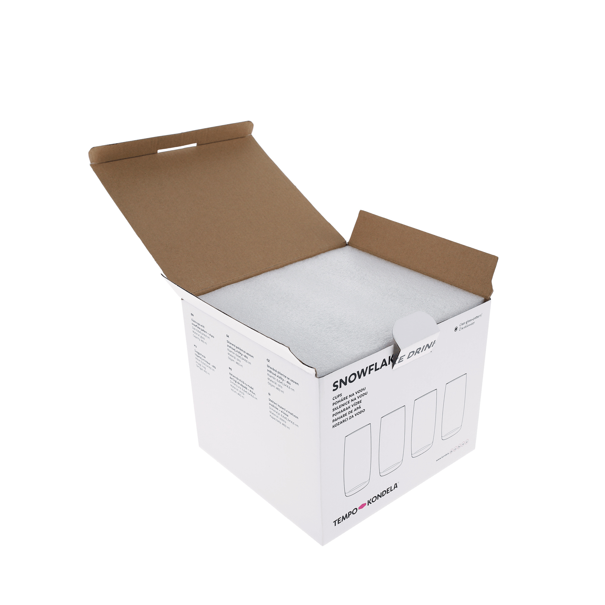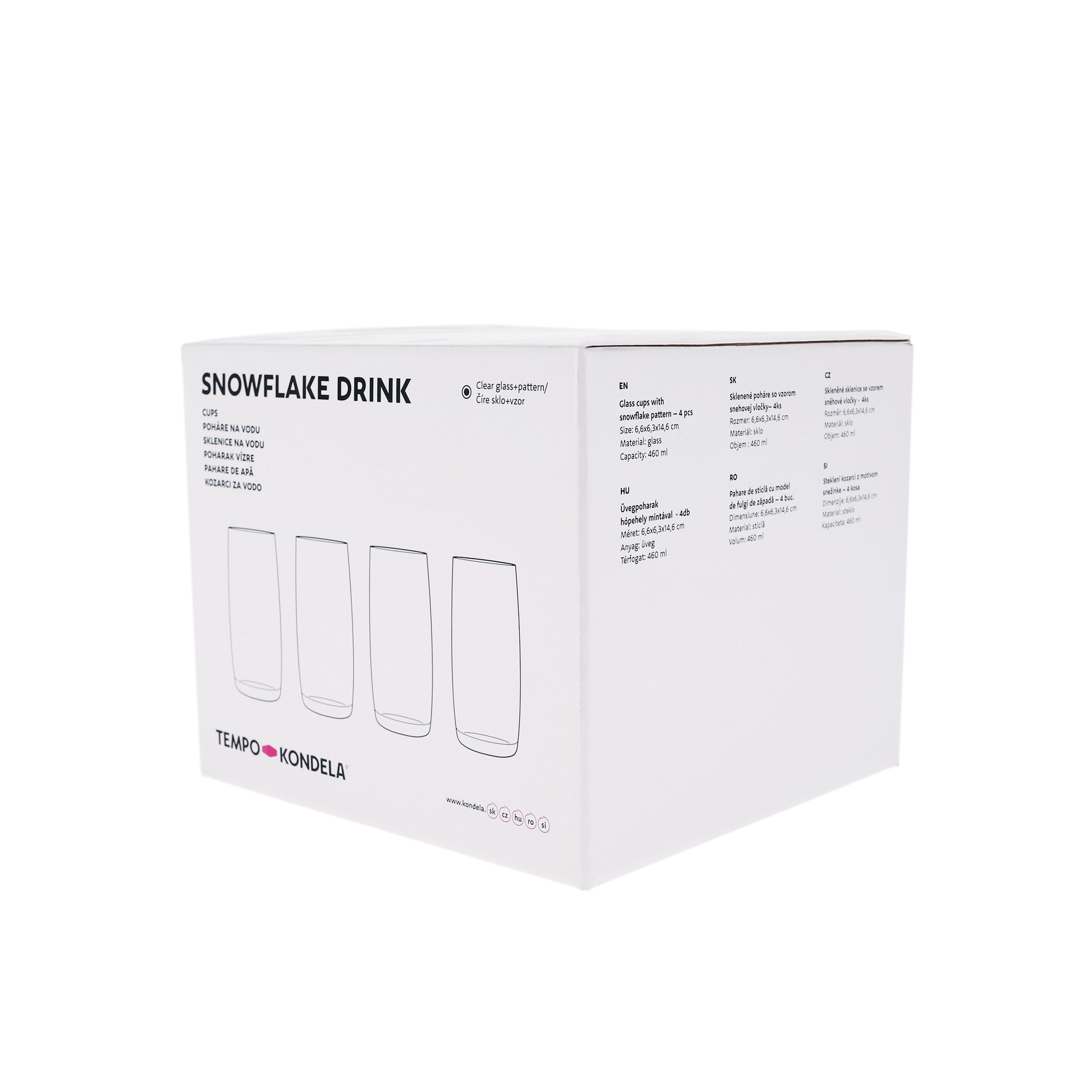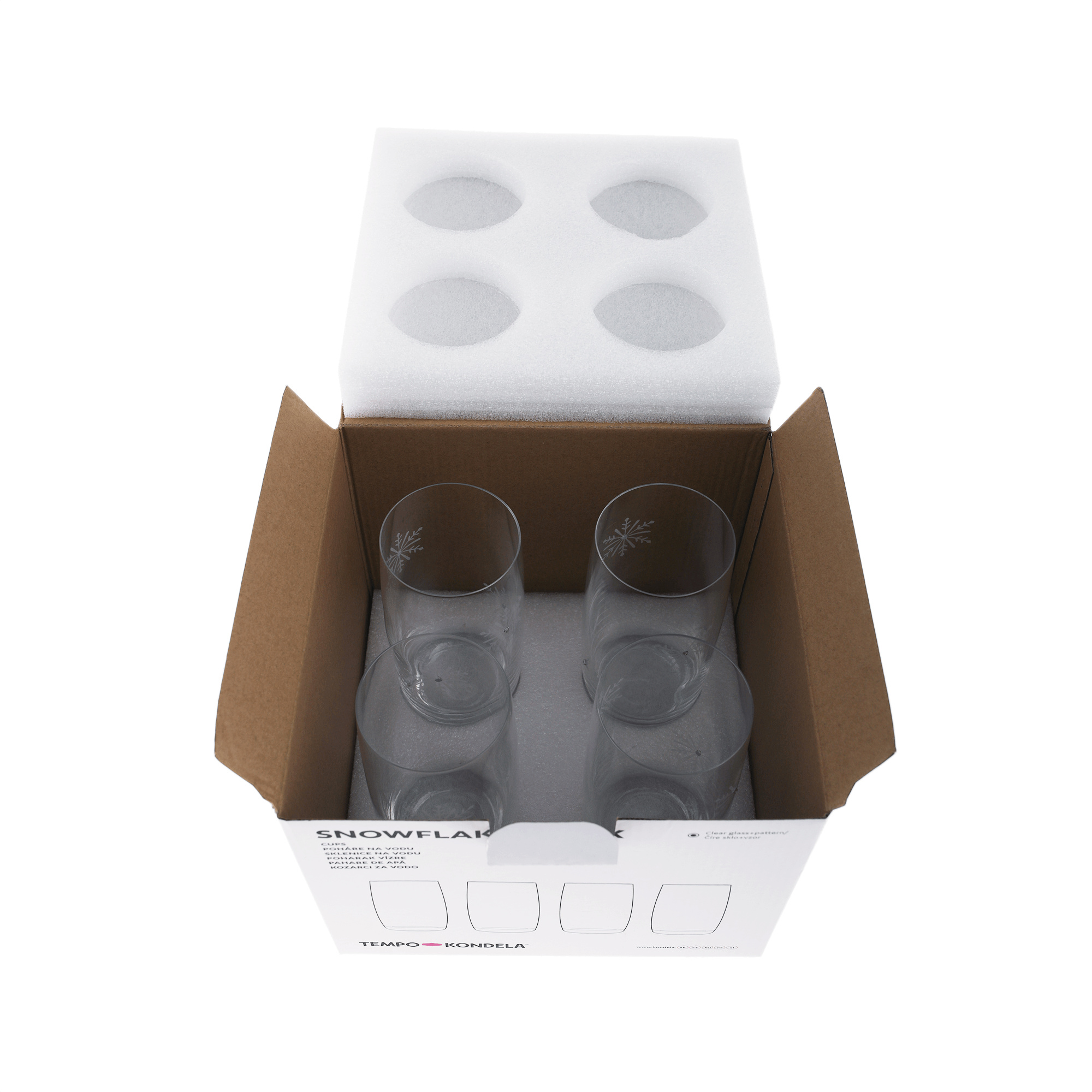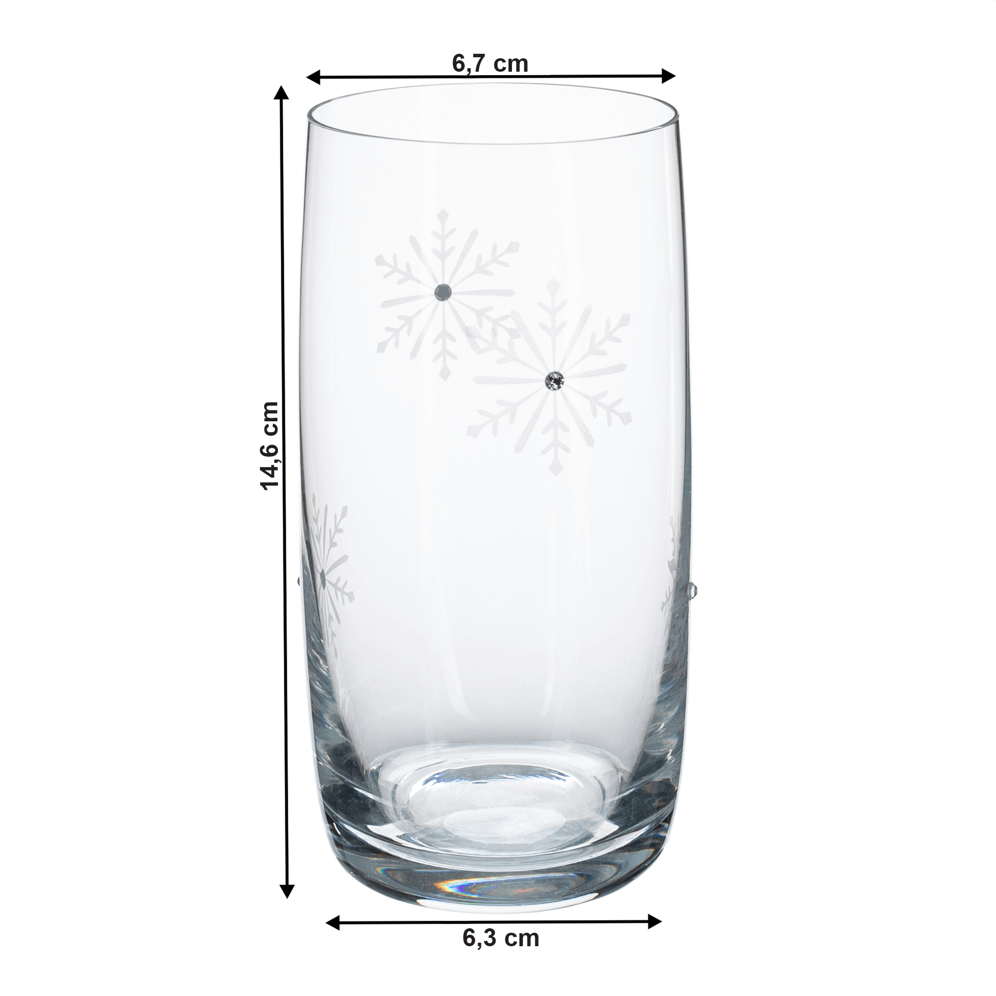 Set 4 ks sklenic na vodu Materiál: sklo Barva: čirá / bílá Rozměr (průměr x V): 6,7x14,6 cm Spodní průměr: 6,3 cm Objem poháru: 460 ml Hmotnost poháru: 225 g Vánoční design Zdobené vločkami s umělým diamantem Nevhodné do mikrovlnné trouby Nevhodné do myčky
