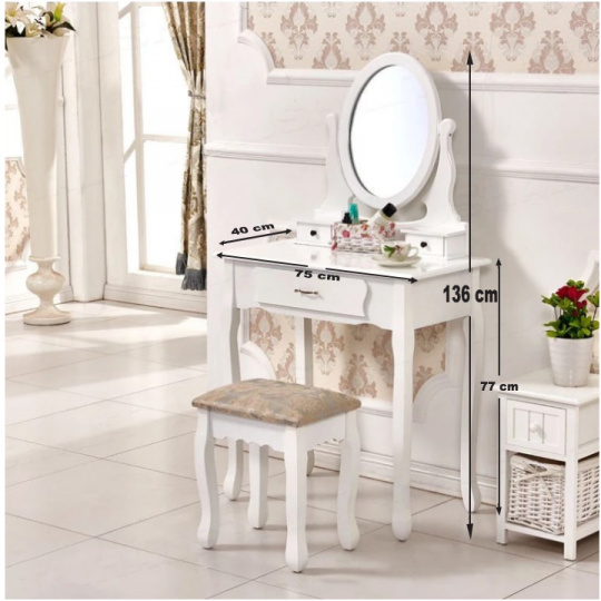 Toaletní stolek v barokním stylu se zrcadlem LINET New Materiál: MDF / masivní dřevo / 100% polyester / kovové úchytky Barva: bílá / stříbrná látka Oděruodolnost textilie podle testu Martindale: 84 000 oděrek Rozměry stolek (ŠxHxV): 75x40x136 cm Rozměry taburet (ŠxHxV): 40x30x45 cm Tloušťka materiálu: 15 mm Nosnost stolku: 25 kg Nosnost taburetu: 100 kg Dodávané v demontu.