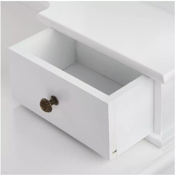 Toaletní stolek se zrcadlem ELIS Materiál: DTD laminovaná Barva: bílá / dub sonoma Rozměry (ŠxHxV): 114x40x78 cm Tloušťka materiálu: 16 mm Šířka šuplík: 52,6 cm Šířka části se zrcadlem: 39,6 cm Dodávané v demontu. Hmotnost: 28.5kg