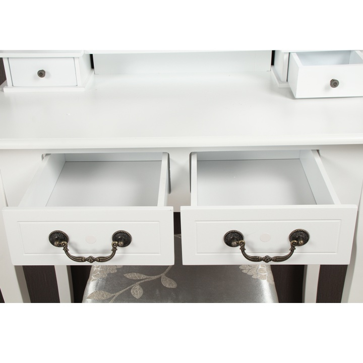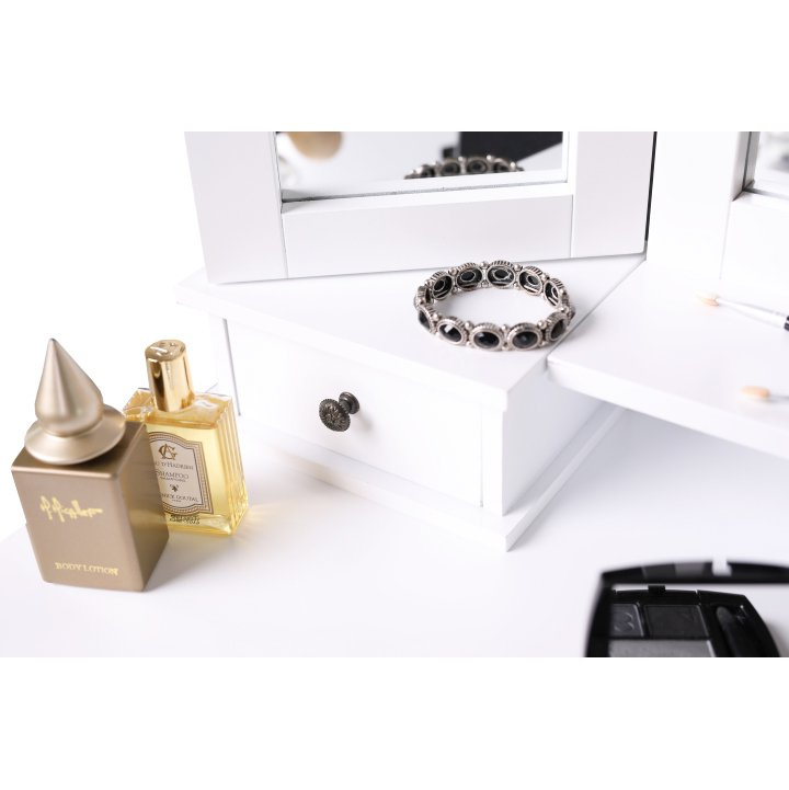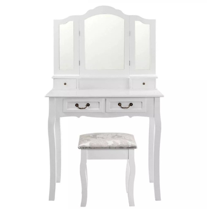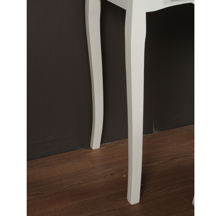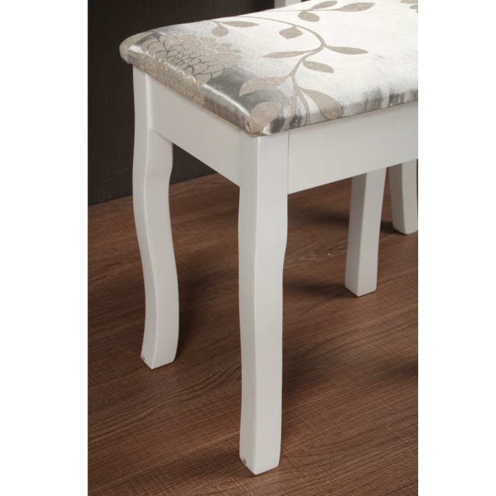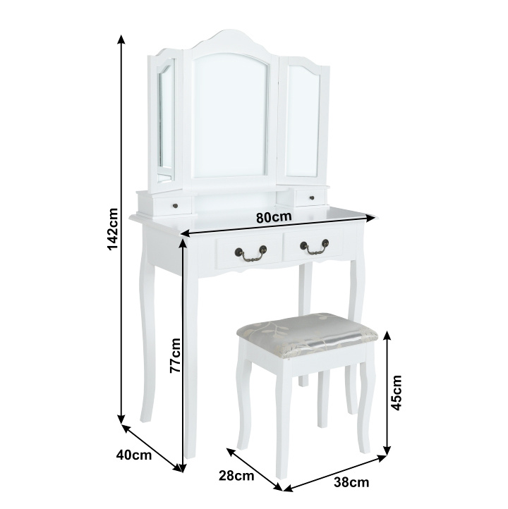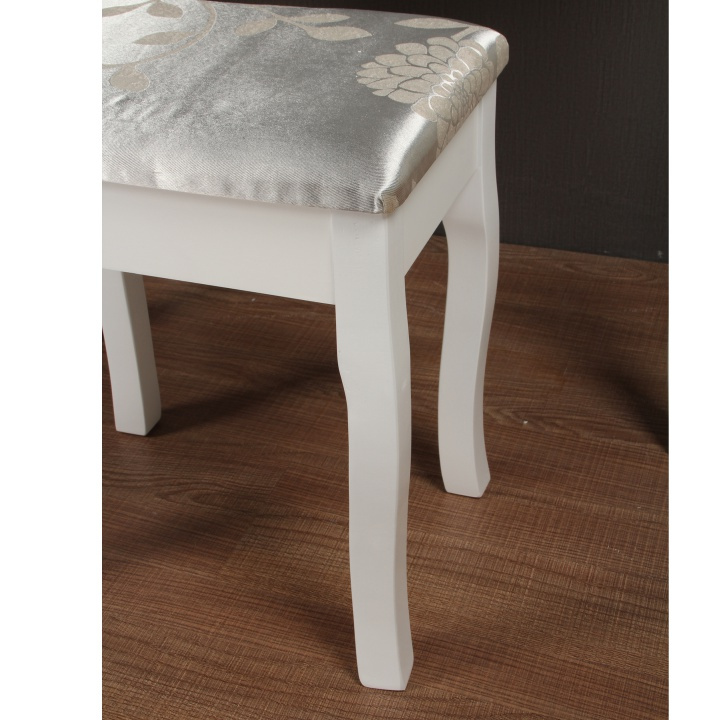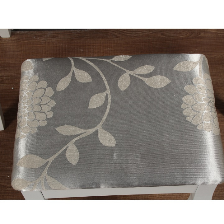 Toaletní stolek REGINA NEW z masivního dřeva s 4 šuplíky, v barokním stylu Barevné provedení: bílá / stříbrná Rozměry: (ŠxVxH) 80x40x142 cm, rozměry taburetu (ŠxHxV): 38x28x45 cm Materiál: MDF / masivní dřevo / látka / 100% polyester / kovové úchytky. Tloušťka materiálu: 15 mm Nosnost stolku: 25 kg Nosnost taburetu: 100 kg Dodávané v demontu.