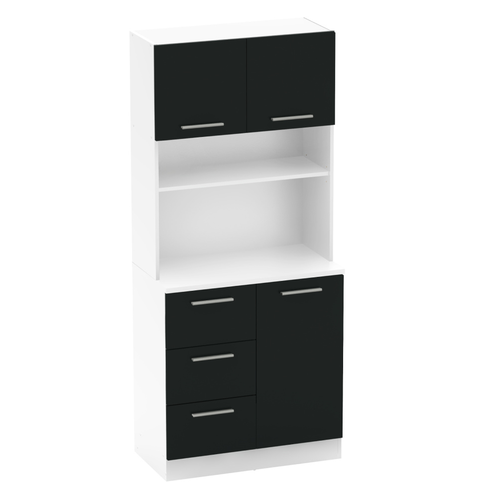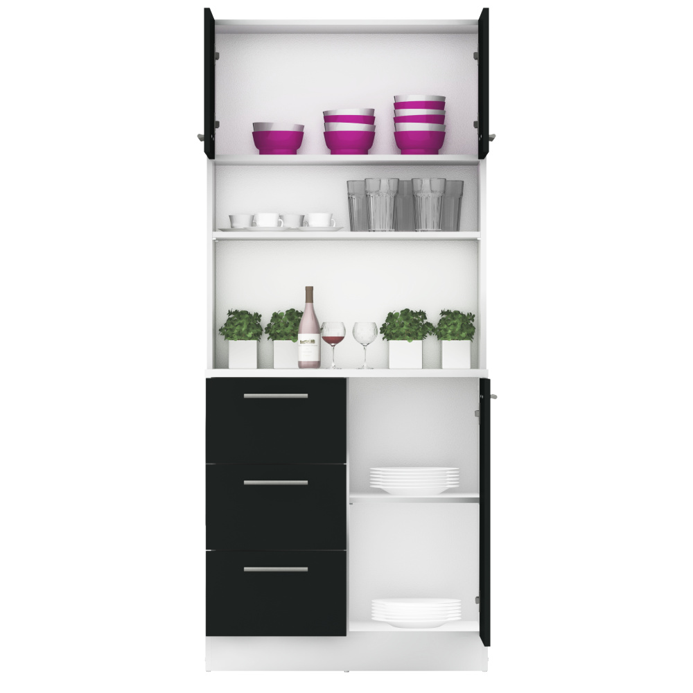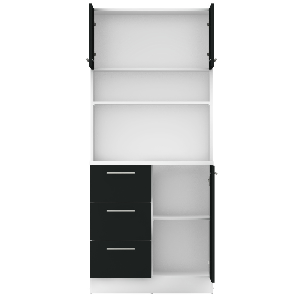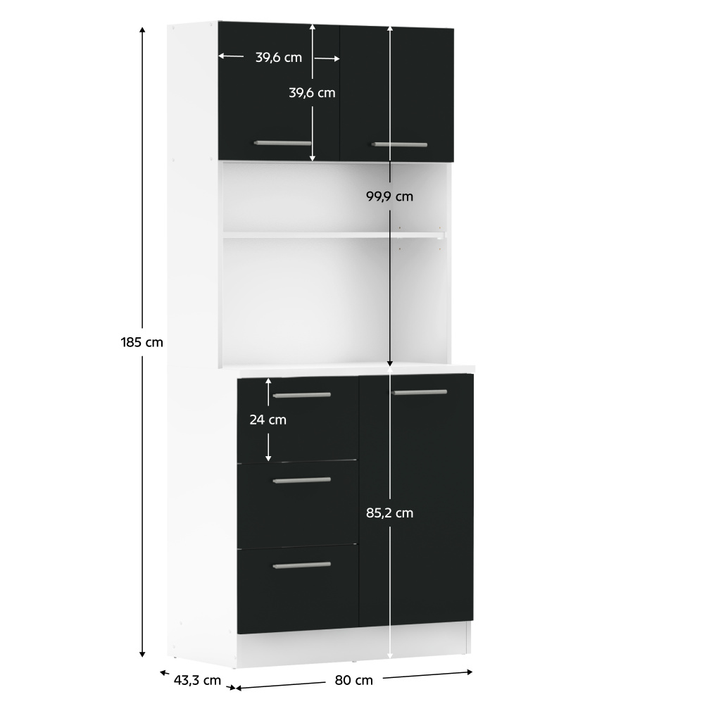 Materiál: DTD laminovaná Barva: bílá/černá Rozměry (ŠxHxV): 80x43,3x185 cm Tloušťka materiálu: 1,6 cm Tloušťka vrchního plátu spodní skříňky: 2,2 cm Třídveřový Policový Nosnost police: 5 kg 3 zásuvky Rozměry zásuvky (ŠxV): 39,6x24 cm S úchytkami Materiál úchytek: PVC Barva úchytek: stříbrná Na kluzácích Praktický Víceúčelový Kvalitní slovenský výrobek Doporučujeme připevnit ke zdi Dodáváno v demontu