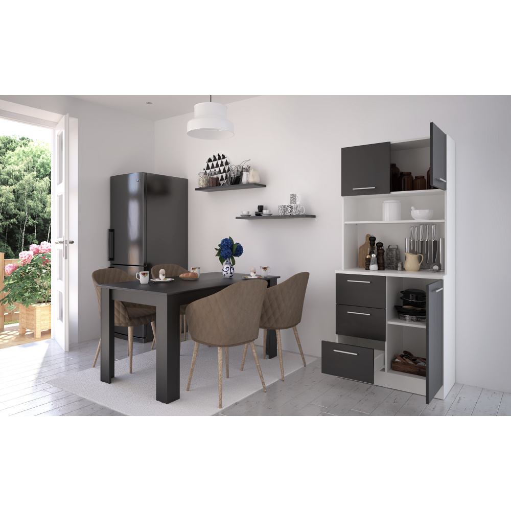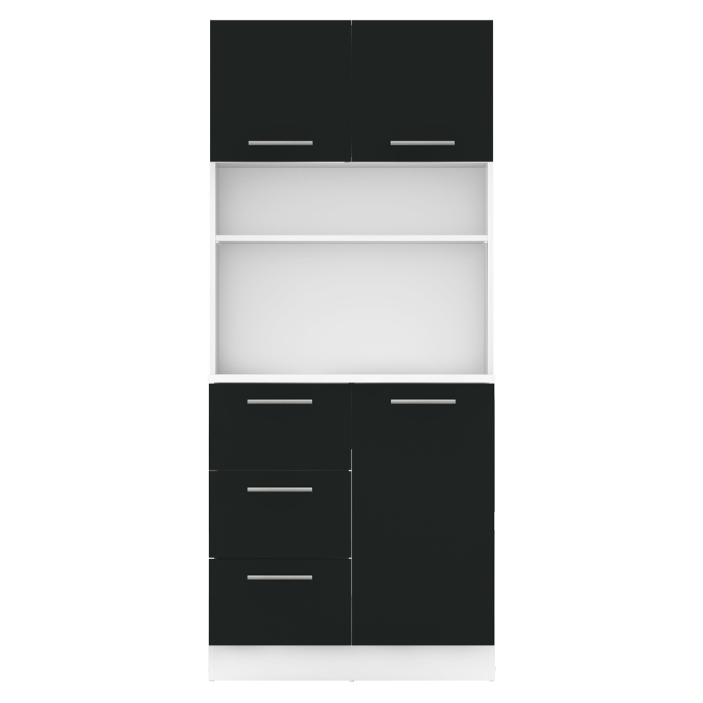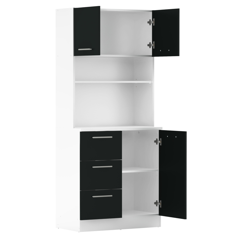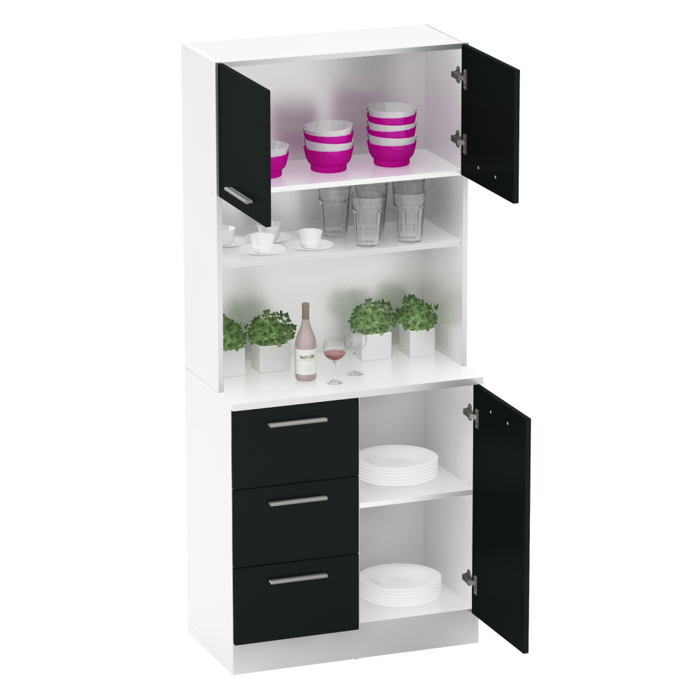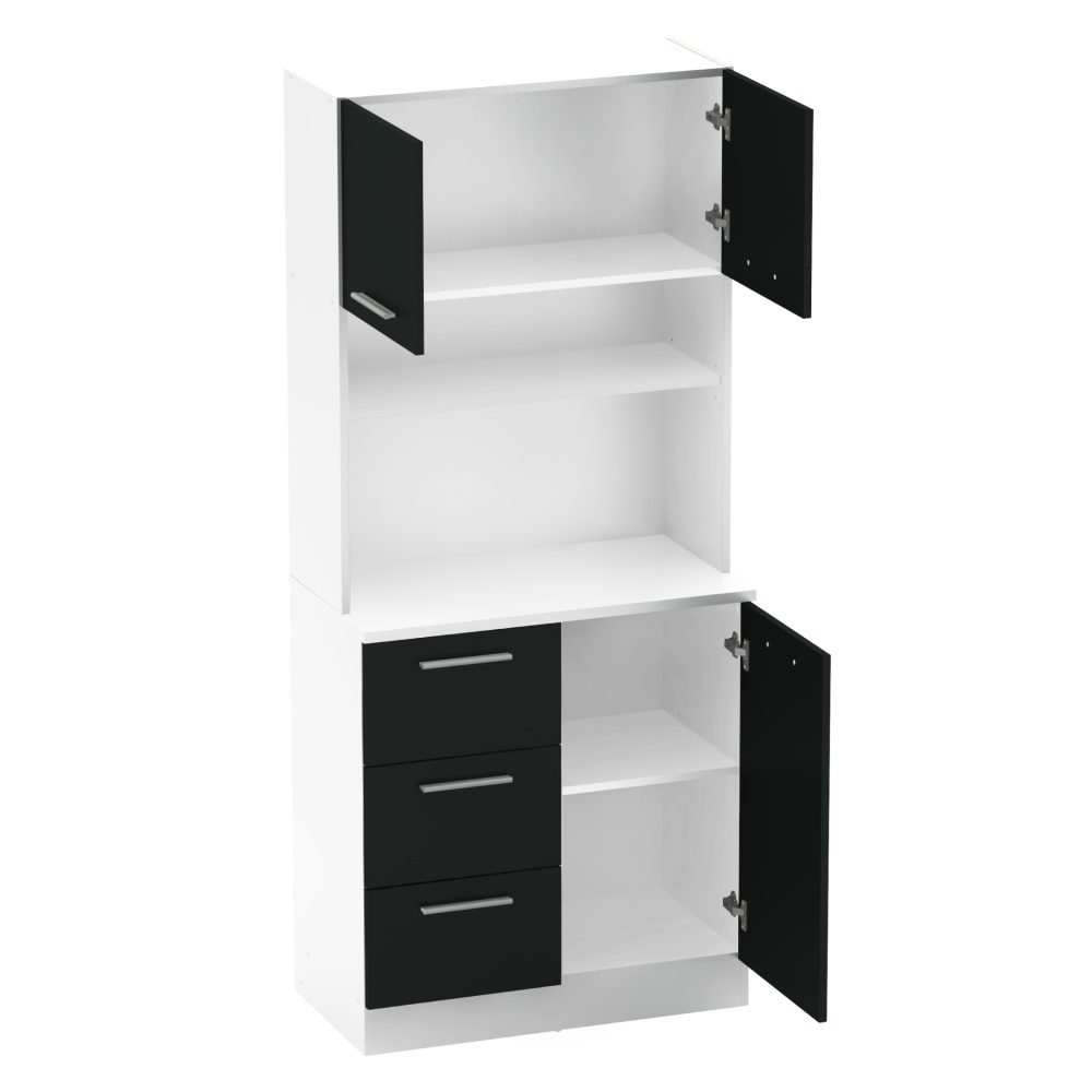Materiál: DTD laminovaná Barva: bílá/černá Rozměry (ŠxHxV): 80x43,3x185 cm Tloušťka materiálu: 1,6 cm Tloušťka vrchního plátu spodní skříňky: 2,2 cm Třídveřový Policový Nosnost police: 5 kg 3 zásuvky Rozměry zásuvky (ŠxV): 39,6x24 cm S úchytkami Materiál úchytek: PVC Barva úchytek: stříbrná Na kluzácích Praktický Víceúčelový Kvalitní slovenský výrobek Doporučujeme připevnit ke zdi Dodáváno v demontu