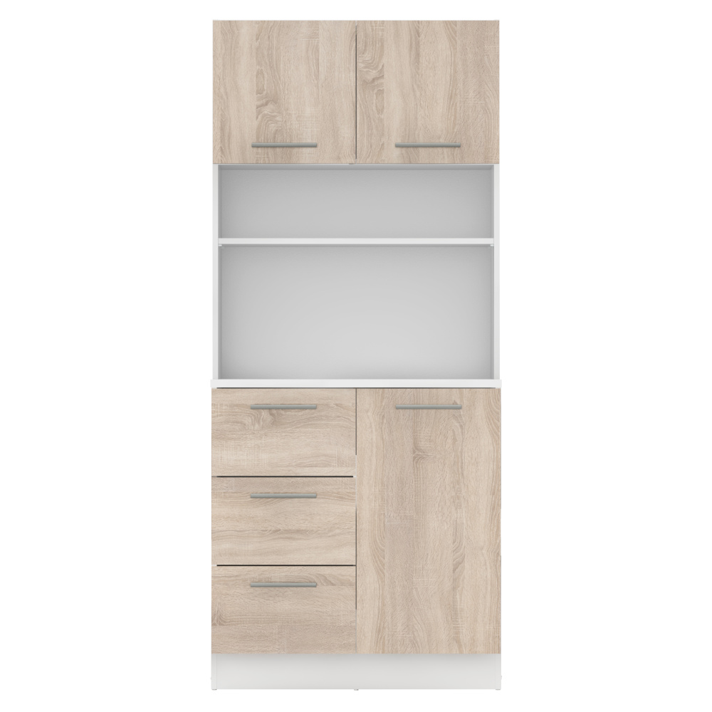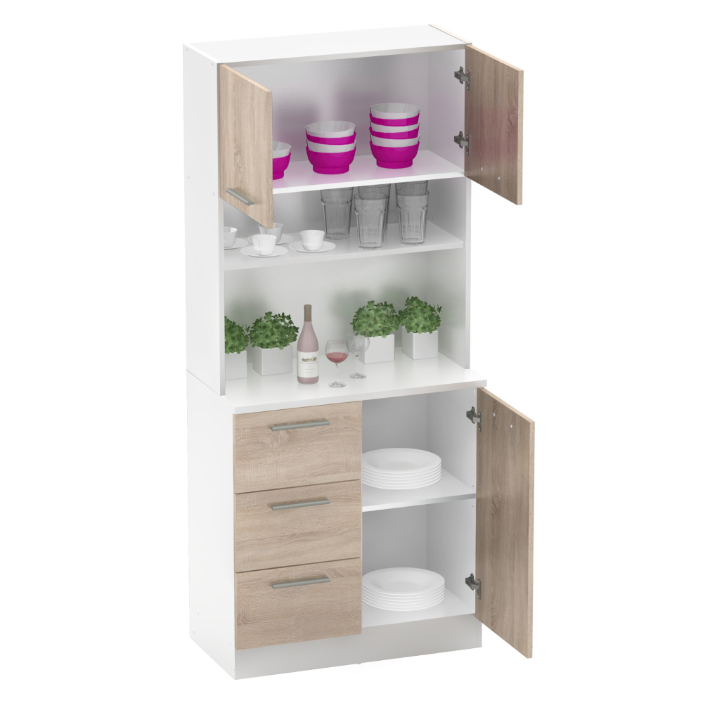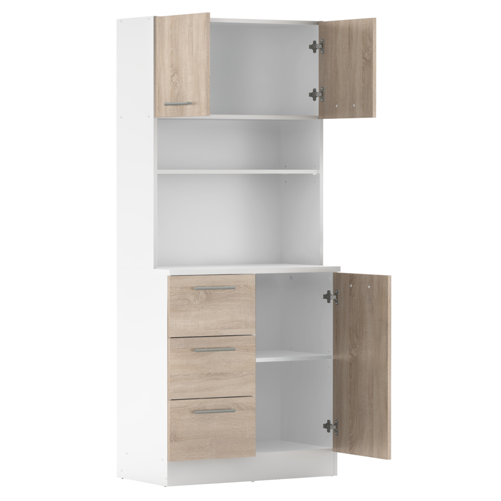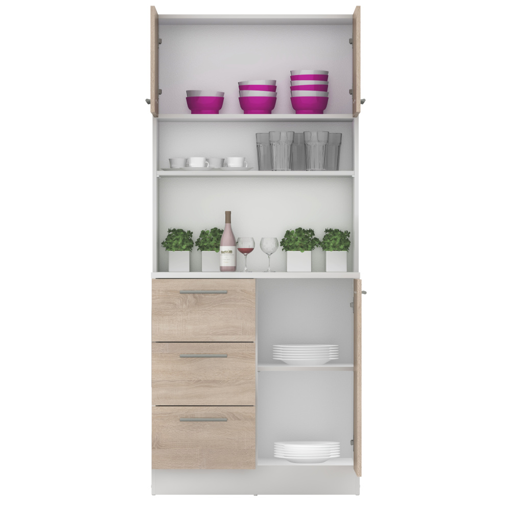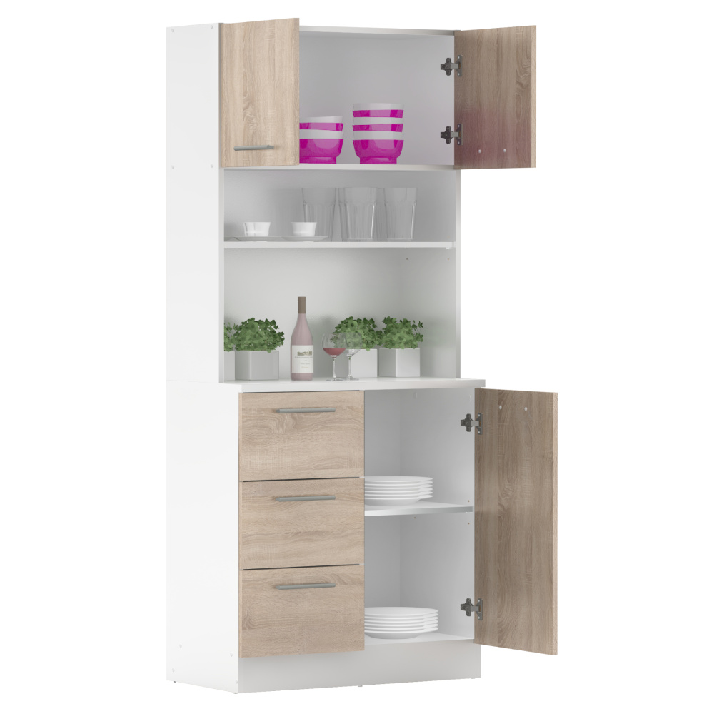 Materiál: DTD laminovaná Barva: bílá/dub sonoma Rozměry (ŠxHxV): 80x43,3x185 cm Tloušťka materiálu: 1,6 cm Tloušťka vrchního plátu spodní skříňky: 2,2 cm Třídveřový Policový Nosnost police: 5 kg 3 zásuvky Rozměry zásuvky (ŠxV): 39,6x24 cm S úchytkami Materiál úchytek: PVC Barva úchytek: stříbrná Na kluzácích Praktický Víceúčelový Kvalitní slovenský výrobek Doporučujeme připevnit ke zdi Dodáváno v demontu