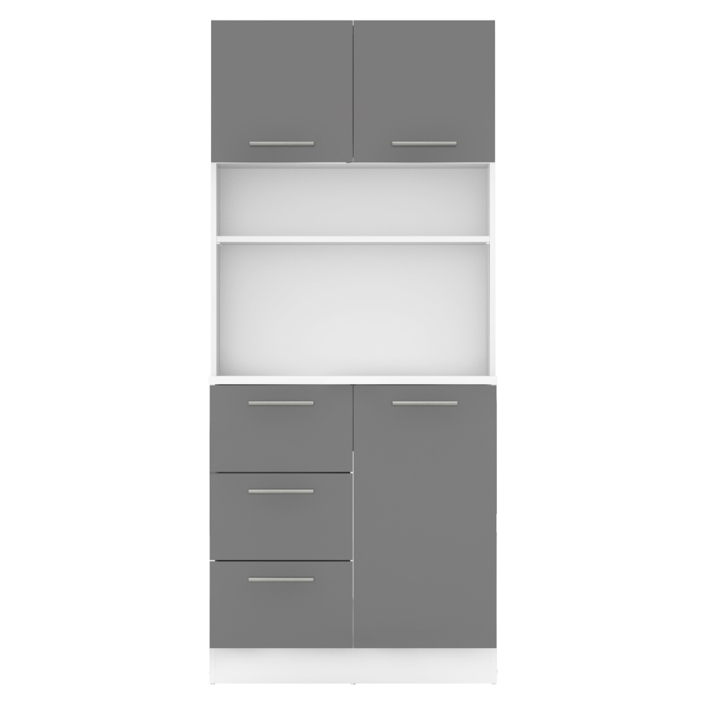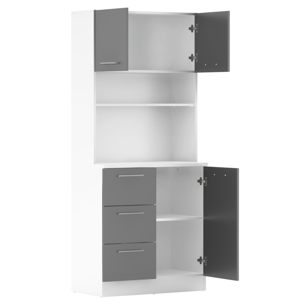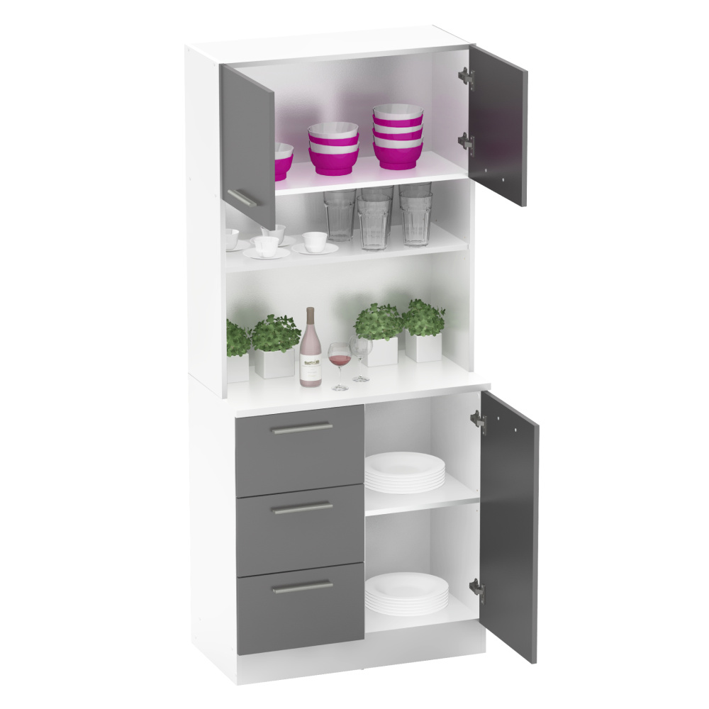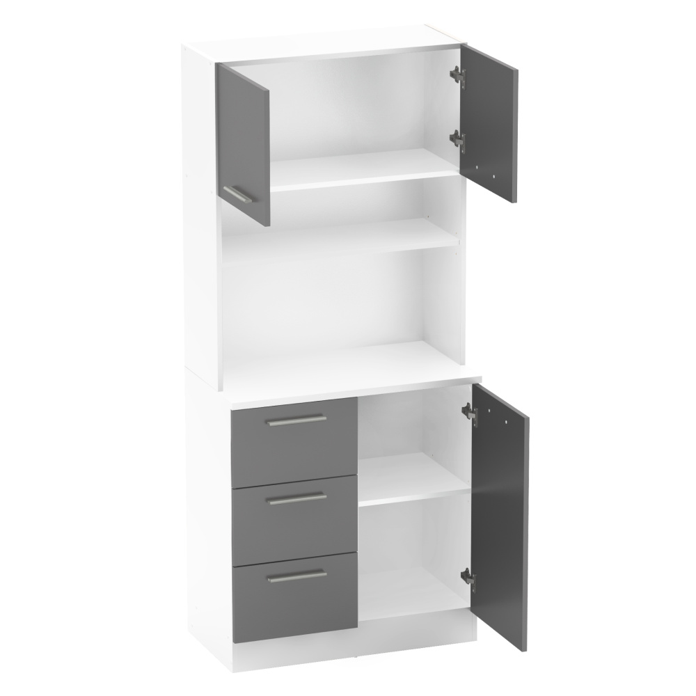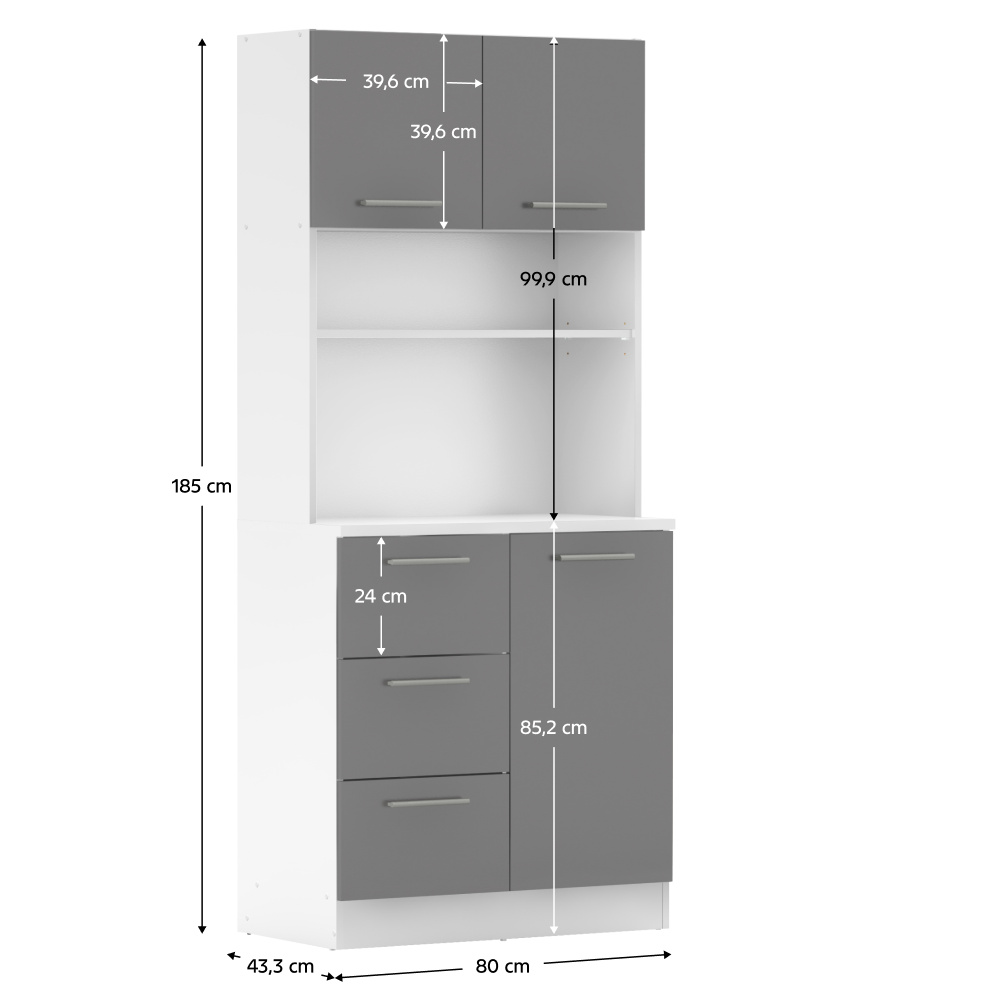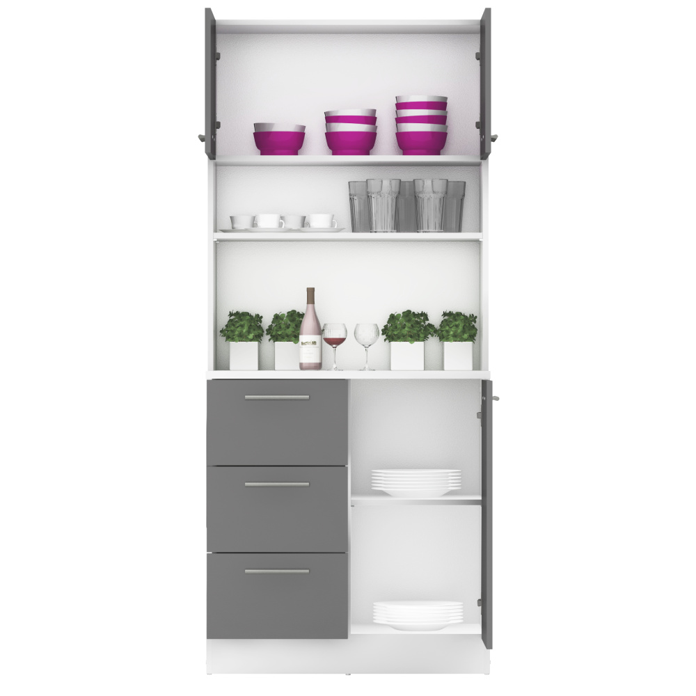 Materiál: DTD laminovaná Barva: bílá/grafit Rozměry (ŠxHxV): 80x43,3x185 cm Tloušťka materiálu: 1,6 cm Tloušťka vrchního plátu spodní skříňky: 2,2 cm Třídveřový Policový Nosnost police: 5 kg 3 zásuvky Rozměry zásuvky (ŠxV): 39,6x24 cm S úchytkami Materiál úchytek: PVC Barva úchytek: stříbrná Na kluzácích Praktický Víceúčelový Kvalitní slovenský výrobek Doporučujeme připevnit ke zdi Dodáváno v demontu