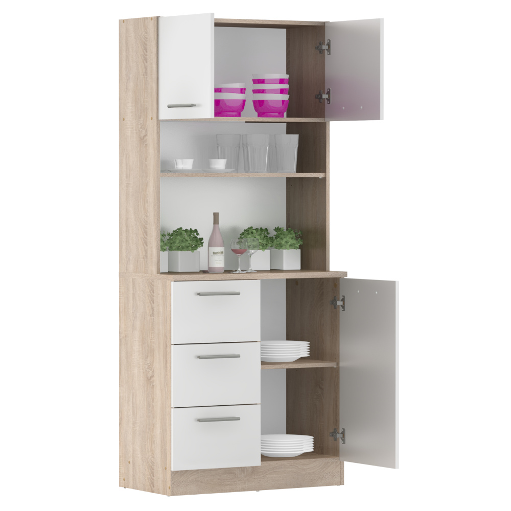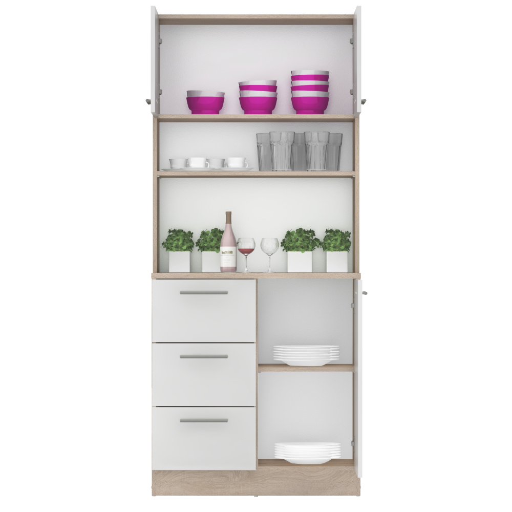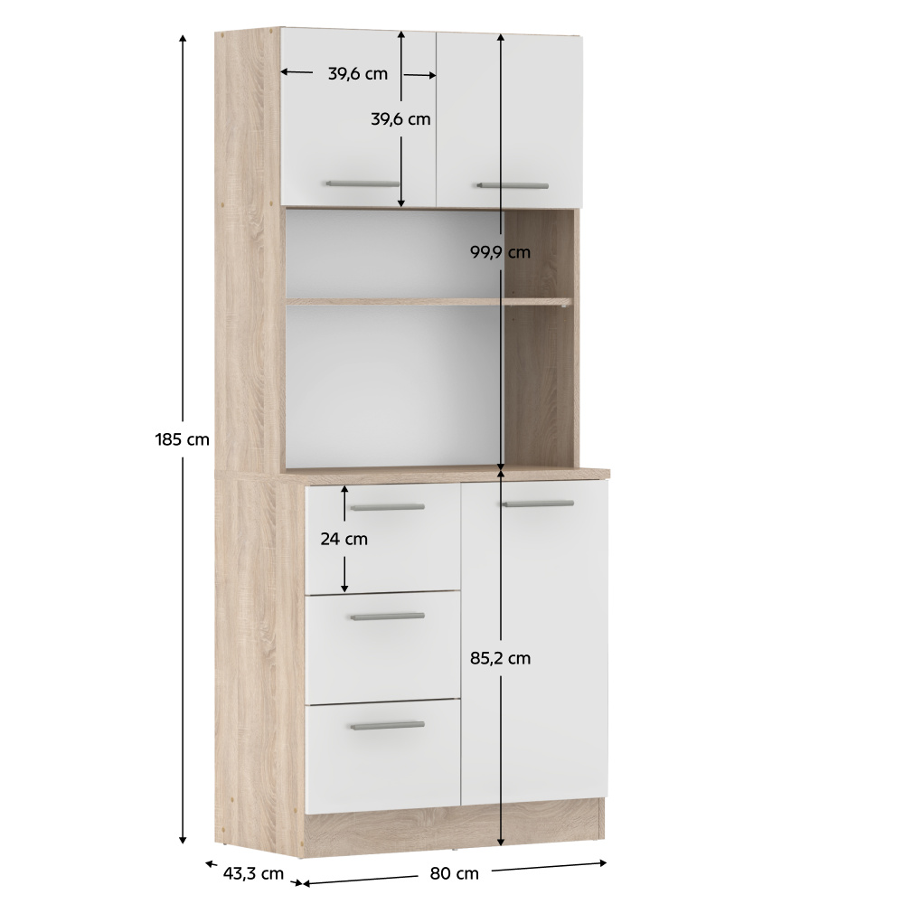 Materiál: DTD laminovaná Barva: dub sonoma/bílá Rozměry (ŠxHxV): 80x43,3x185 cm Tloušťka materiálu: 1,6 cm Tloušťka vrchního plátu spodní skříňky: 2,2 cm Třídveřový Policový Nosnost police: 5 kg 3 zásuvky Rozměry zásuvky (ŠxV): 39,6x24 cm S úchytkami Materiál úchytek: PVC Barva úchytek: stříbrná Na kluzácích Praktický Víceúčelový Kvalitní slovenský výrobek Doporučujeme připevnit ke zdi Dodáváno v demontu