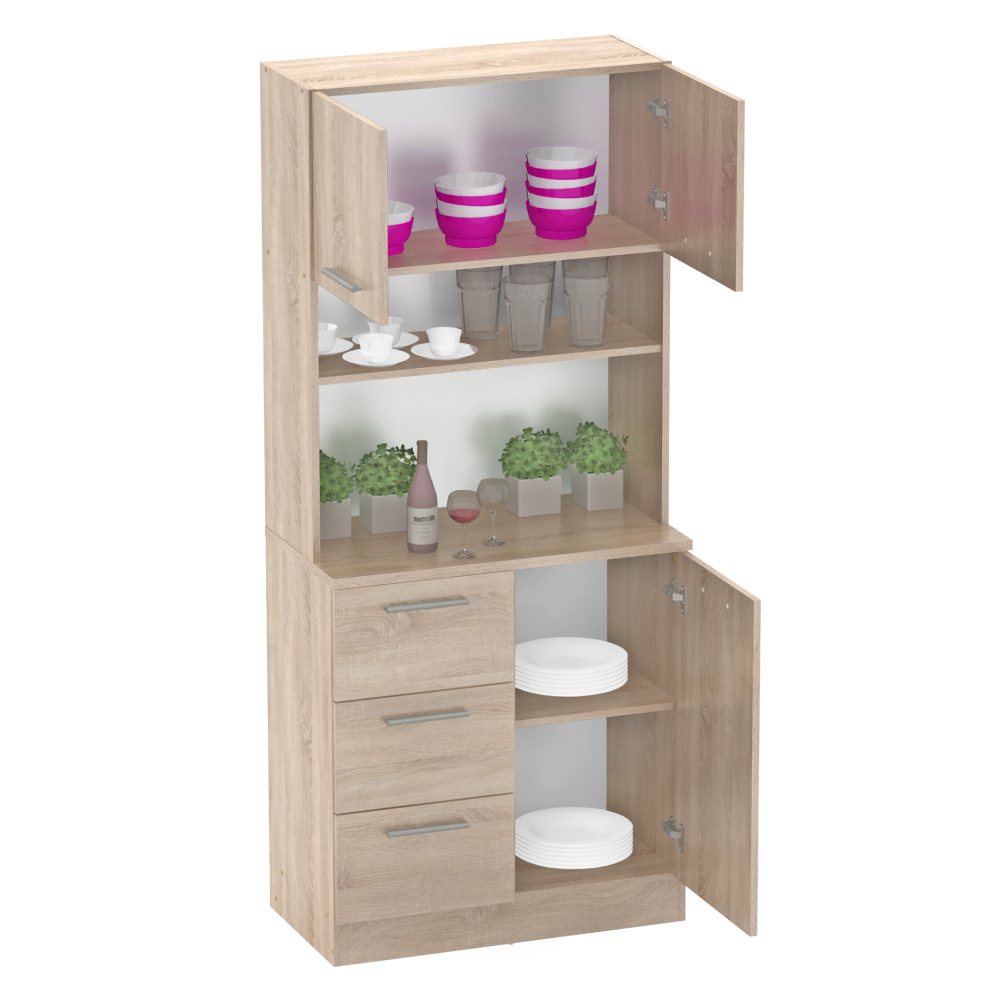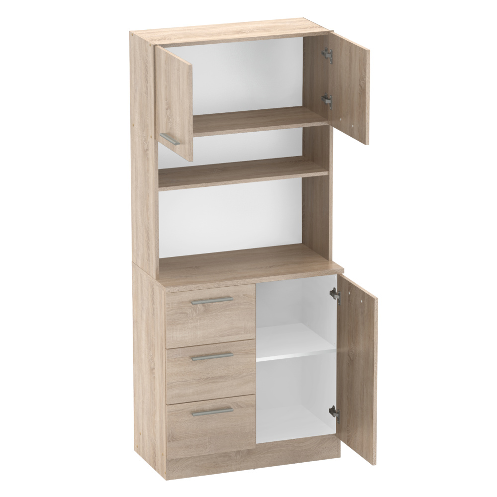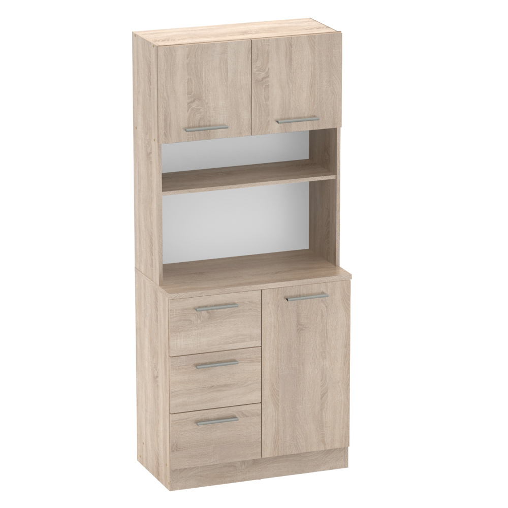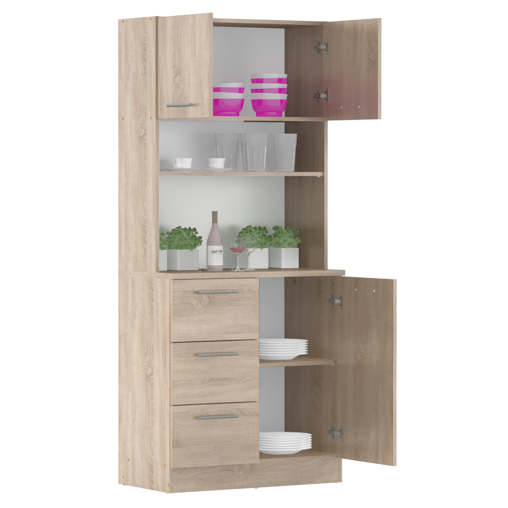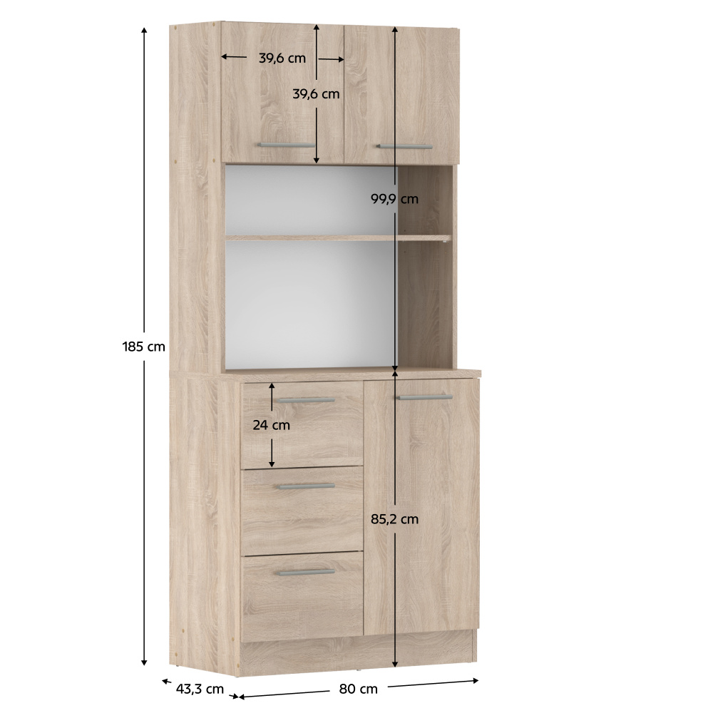Materiál: DTD laminovaná Barva: dub sonoma Rozměry (ŠxHxV): 80x43,3x185 cm Tloušťka materiálu: 1,6 cm Tloušťka vrchního plátu spodní skříňky: 2,2 cm Třídveřový Policový Nosnost police: 5 kg 3 zásuvky Rozměry zásuvky (ŠxV): 39,6x24 cm S úchytkami Materiál úchytek: PVC Barva úchytek: stříbrná Na kluzácích Praktický Víceúčelový Kvalitní slovenský výrobek Doporučujeme připevnit ke zdi Dodáváno v demontu