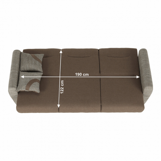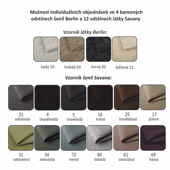 ;"3-sed, rozkládací, MILO. Materiál a barva: korpus šenil Berlin 3 + sedací část savana 25 hnědá. Oděruodolnost textilie Savana podle testu Martindale: 80 000 oděrek Oděruodolnost textilie Berlin podle testu Martindale: 55 000 oděrek Rozměry v cm (ŠxHxV): 3-sed 221x91x90, plocha na spaní 190x122. Nosnost na osobu: 90 kg Možnost individuálních objednávek v odstínu Berlin 03 a 12 odstínech látky Savana. Při individuální objednávce je třeba zaplatit 20% zálohu z dané částky. Po uhrazení zálohy bude Váš požadavek zadán do výroby. Dodací lhůta 6-8 týdnů.