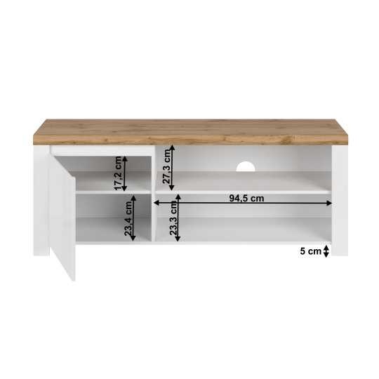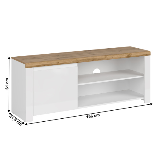Materiál: DTD laminovaná/ABS hrany/MDF Barva: bílý extra vysoký lesk/dub wotan Rozměry (ŠxHxV): 156x41,5x61 cm Výška spodního prostoru od podlahy: 5 cm Tloušťka materiálu: 1,6 - 2,2 cm Jedna skříňka Ve skříňkách police Výška první police: 17,2 cm Výška druhé police: 23,4 cm Otevřený úložný prostor s policí Rozměry spodního otevřeného prostoru (ŠxV): 94,5x23,3 cm Výška otevřeného prostoru: 27,3 cm Otvor pro vývod kabelů MDF dvířka Dodáván v demontu