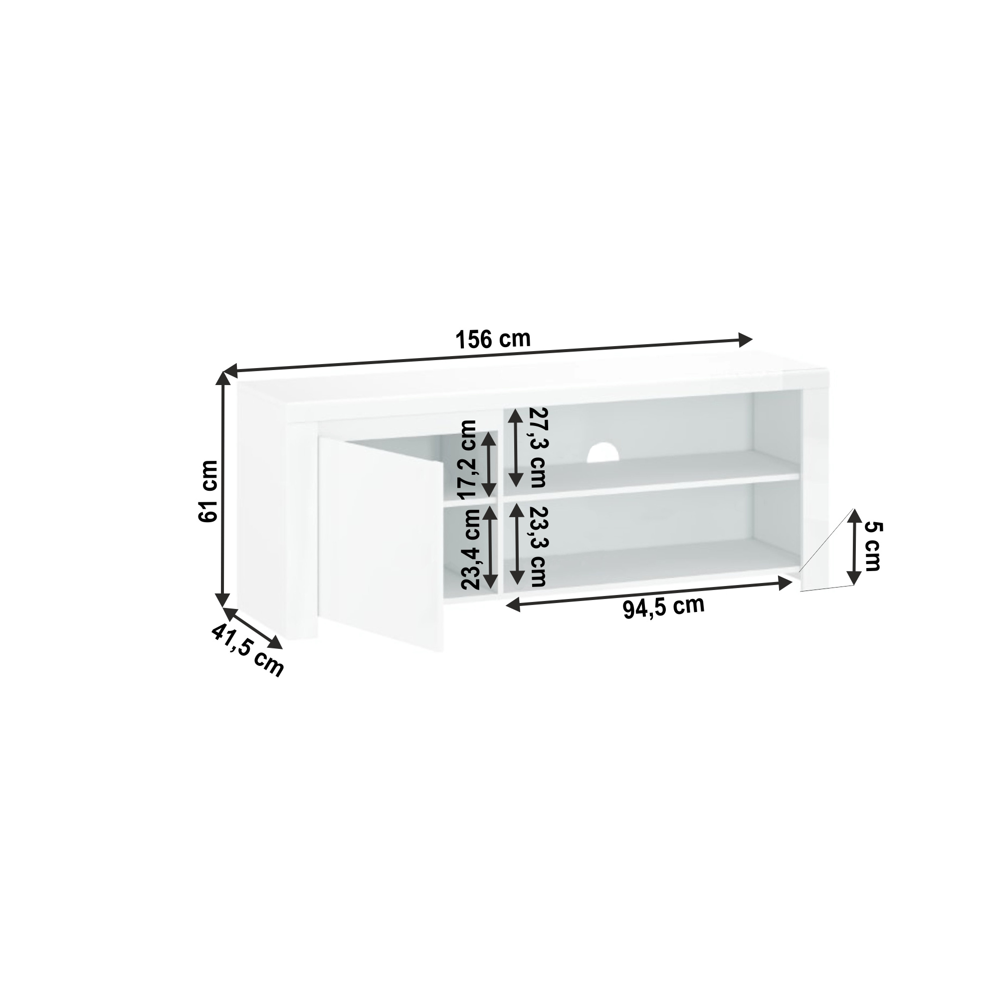 Materiál: laminovaná DTD / MDF Barva: bílý lesk Rozměry (ŠxHxV): 156x41,5x61 cm Materiál dvířka: MDF Tloušťka materiálu: 1,6 cm ABS hrany Dvířka z MDF kombinovaná skříňka Obsahuje otevřené police a otevírací skříňku Otevřený i uzavřený úložný prostor bez úchytek Moderní design a elegantní vzhled Dodávané v demontu