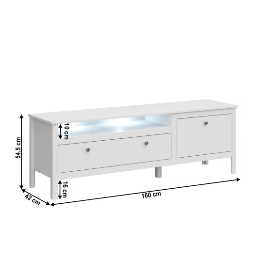 Materiál: DTD laminovaná/ABS hrany/MDF Barva: bílá Rozměry(ŠxHxV): 160x42x54,5 cm Výška nožiček: 16 cm Tloušťka materiálu: 1,6 cm Jedna skříňka s výklopem Jeden šuplík Otevřený úložný prostor Výška otevřeného prostoru: 10 cm Bez LED osvětlení Možnost dokoupení LED osvětlení MDF dvířka Dodáván v demontu