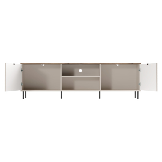 Materiál: laminovaná DTD/fóliovaná MDF/ABS hrany Barva: kašmír/dub castello Rozměry (ŠxHxV): 183,4x40x55,2 cm Tloušťka materiálu: 1,6 cm Dvoudveřový Dvě skříňky Rozměry skříňky (ŠxV): 59,6x39,6 cm Police Šířka police: 58,3 cm Otevřený úložný prostor Otvor pro vývod kabelů S úchytkami Materiál úchytek: kov Barva úchytek: černá Na nožičkách Materiál nožiček: kov Barva nožiček: černá Výška nožiček: 12 cm Nosnost vrchní desky: 10 kg Nosnost police: 8 kg Dekorativní dvířka Moderní design Doporučujeme připevnit ke stěně Dodáváno v demontu