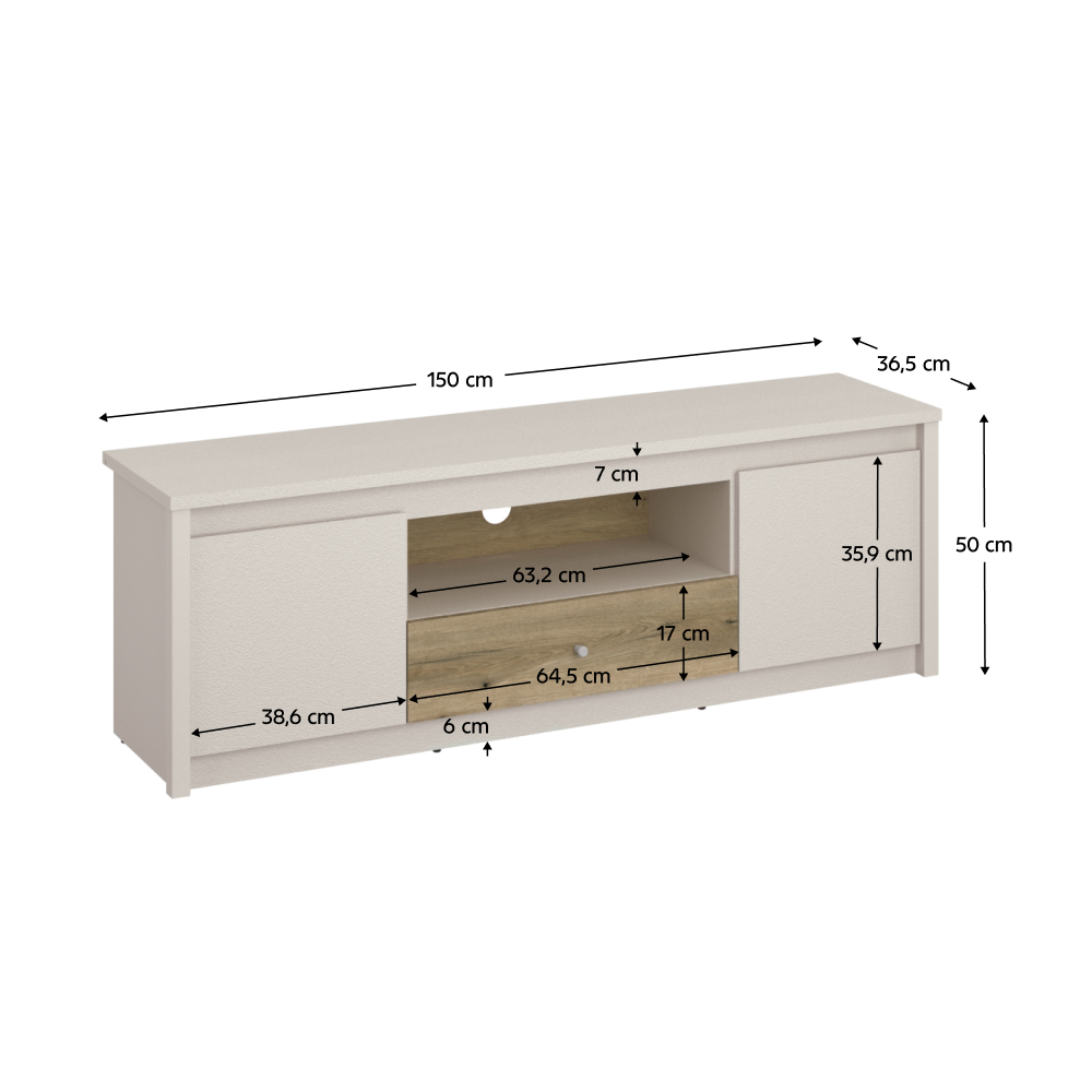 Materiál: laminovaná DTD Barva: kašmír/dub evoke Rozměry (ŠxHxV): 150x36,5x50 cm Tloušťka materiálu DTD: 1,6-3,2 cm Dvoudveřový Otevřený úložný prostor Zásuvka S úchytkou Materiál úchytky: plast Barva úchytky: kašmír Nosnost zásuvky: 3 kg 2x skříňka Bez úchytky Šikmý zářez Barva sololitu: dub evoke Nosnost vrchní desky: 10 kg Kluzáky Výška kluzáků: 0,3 cm Otvor pro vývod kabelů Moderní design Doporučujeme připevnit ke zdi Dodáváno v demontu