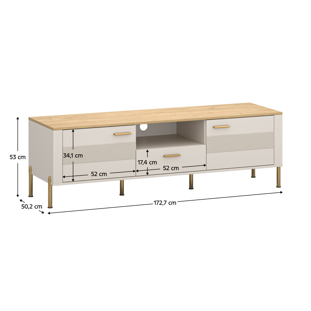Materiál: DTD laminovaná/fóliovaná MDF/PVC Barva: kašmír/dub kamenný Rozměry (ŠxHxV): 172,7x50,2x53 cm Tloušťka materiálu: 1,6 cm Otvor pro vývod kabelů Dvoudveřový Otevřený úložný prostor Šuplík Nosnost šuplíku: 3 kg S úchytkou Materiál úchytky: kov Barva úchytky: zlatá Na nožičkách Materiál nožiček: kov Barva nožiček: zlatá Výška nožiček: 15 cm Dekorativní frézovaná dvířka Moderní design Doporučujeme připevnit ke zdi Dodáváno v demontu