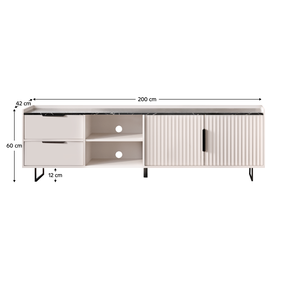 Materiál: laminovaná DTD/fóliovaná MDF Barva: kašmír/černý mramor Rozměry (ŠxHxV): 200x42x60 cm Tloušťka materiálu: 1,6 cm Dvoudveřový Dvě zásuvky Otevřený úložný prostor Policový Nosnost police: 4 kg Nosnost zásuvky: 2 kg Nosnost vrchní desky: 15 kg S úchyty Materiál úchytek: kov Barva úchytek: černá Na nožičkách Materiál nožiček: kov Barva nožiček: černá Výška nožiček: 12 cm Podporná středová nožička Dekorativní dvířka Hrany: papír potažený termoreaktivními polymery Tloušťka DTD zadní strana/dno zásuvky: 0,3 cm Barva zadní strana/dno zásuvky: bílá Plnovýsuvné kuličkové vedení Pánty Otvor pro vývod kabelů Moderní design Doporučujeme připevnit ke stěně Dodáváno v demontu