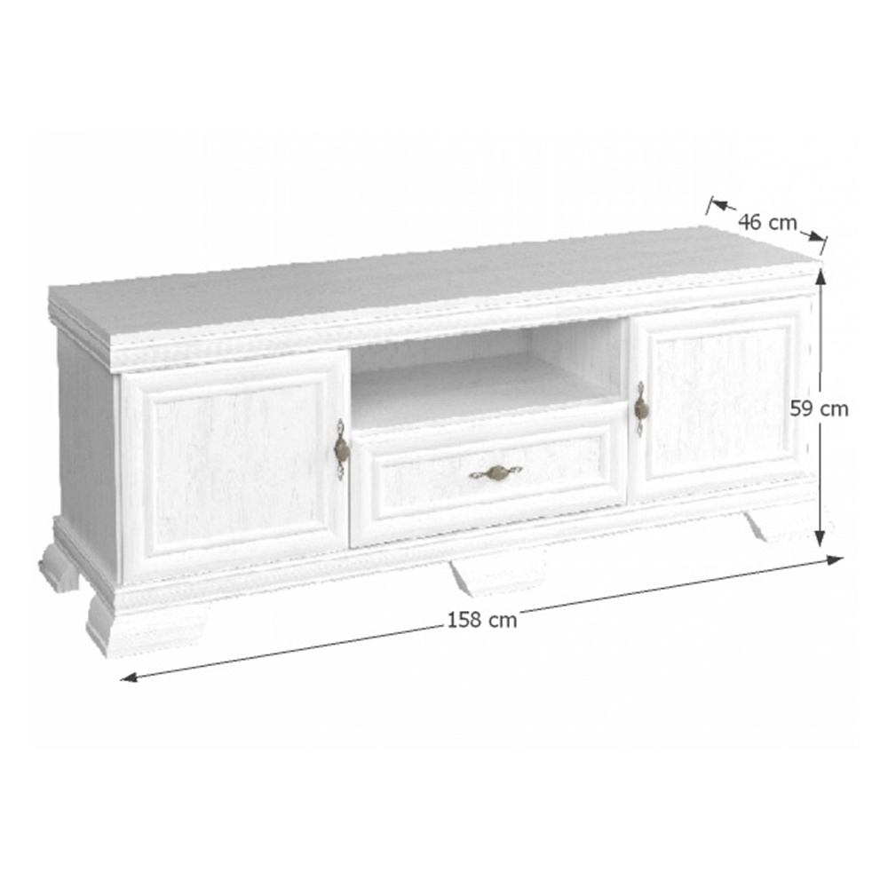 TV stolek KRT KORA NEW Barevné provedení sosna andersen. Materiál laminovaná DTD, MDF, kov. Rozměry (ŠxHxV):157,7x45,8x57,3 cm Tloušťka materiálu korpus: 15 mm Tloušťka materiálu vrchní desky: 22 mm Tloušťka materiálu dolní desky: 22 mm Výška spodního prostoru od podlahy: 10,5 cm