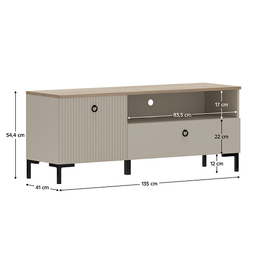 Materiál: laminovaná DTD/fóliovaná MDF Barva: šedohnědá Taupe/dub silverjack Rozměry (ŠxHxV): 135x41x54,4 cm Tloušťka materiálu DTD: 1,6-1,8 cm Tloušťka materiálu MDF: 1,9 cm Jednodveřový Otevřený úložný prostor Jedna zásuvka Nosnost vrchní desky: 10 kg Nosnost police: 5 kg Nosnost zásuvky: 3 kg Otvor pro vývod kabelů S úchytkami Materiál úchytek: kov Barva úchytek: matná černá Na nožičkách Výška nožiček: 12 cm Materiál nožiček: plast Barva nožiček: matná černá Dekorativní frézovaná dvířka Moderní design Doporučujeme připevnit ke zdi Dodáváno v demontu