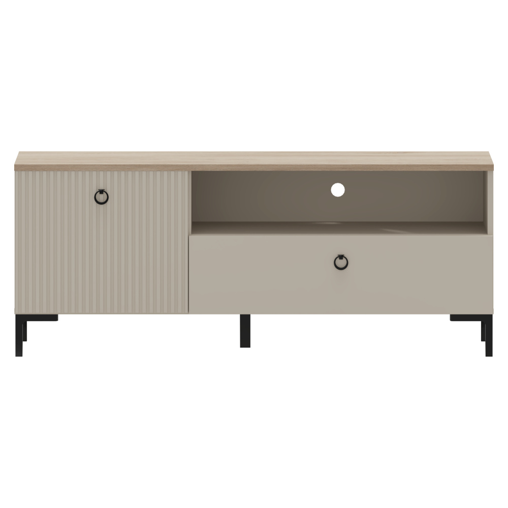 Materiál: laminovaná DTD/fóliovaná MDF Barva: šedohnědá Taupe/dub silverjack Rozměry (ŠxHxV): 135x41x54,4 cm Tloušťka materiálu DTD: 1,6-1,8 cm Tloušťka materiálu MDF: 1,9 cm Jednodveřový Otevřený úložný prostor Jedna zásuvka Nosnost vrchní desky: 10 kg Nosnost police: 5 kg Nosnost zásuvky: 3 kg Otvor pro vývod kabelů S úchytkami Materiál úchytek: kov Barva úchytek: matná černá Na nožičkách Výška nožiček: 12 cm Materiál nožiček: plast Barva nožiček: matná černá Dekorativní frézovaná dvířka Moderní design Doporučujeme připevnit ke zdi Dodáváno v demontu