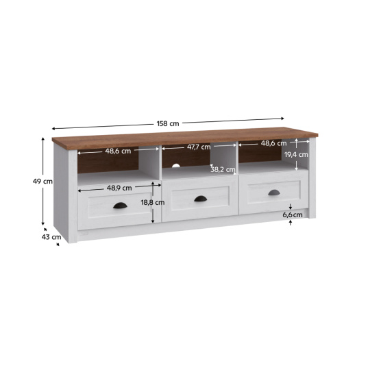 Materiál: DTD laminovaná Barva: sosna andersen/dub lefkas Rozměry (ŠxHxV): 158x43x49 cm Tloušťka materiálu korpus: 15 mm Tloušťka materiálu horní desky: 36 mm Tři šuplíky Tři police Otevřený úložný prostor S úchytkami S otvorem pro kabely Dodáváno v demontu