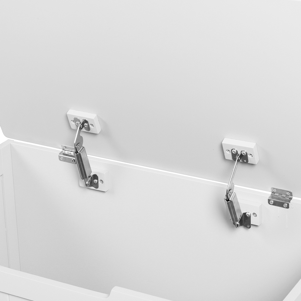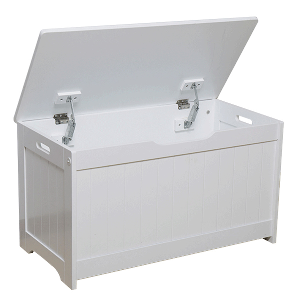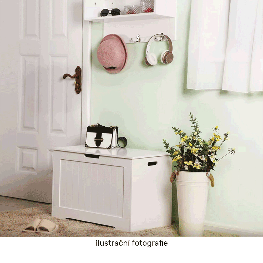 Materiál: MDF Barva: bílá Rozměry (ŠxHxV): 80x40x44,5 cm dřevěný na nožičkách Nosnost vrchní desky: 10 kg Nosnost truhly: 15 kg Otevírání/zavírání pomocí sklopného mechanismu Dva otvory po bocích Praktický úložný box Na hračky, oblečení, prádlo Vhodný do dětských pokojů, ložnic nebo předsíní Dodávané v demontu