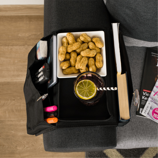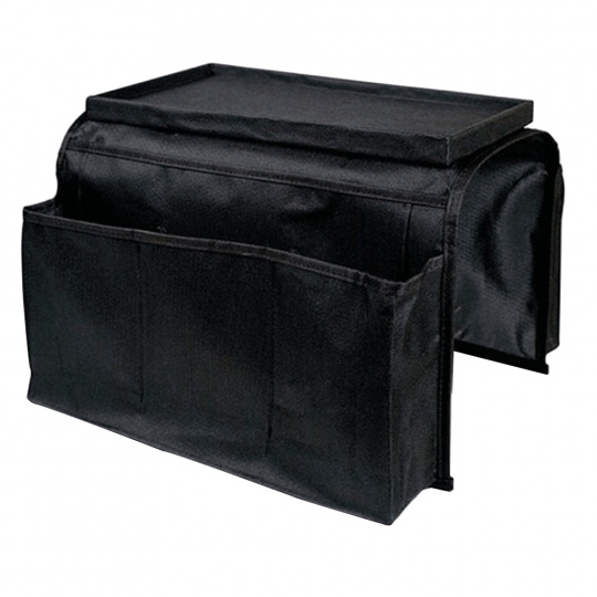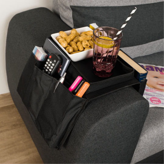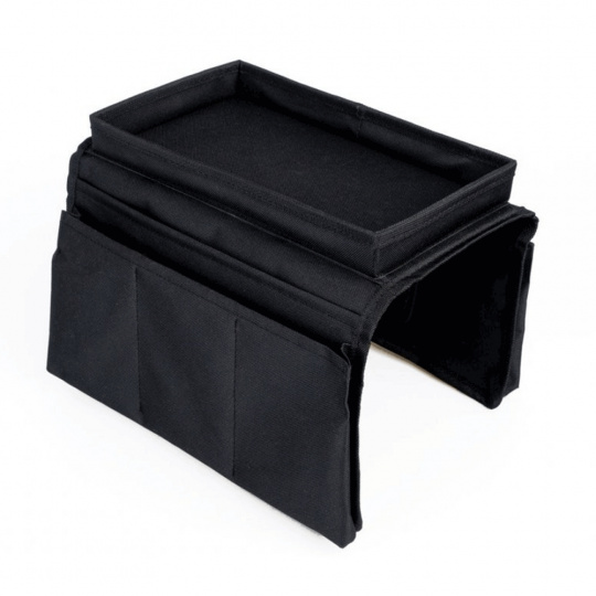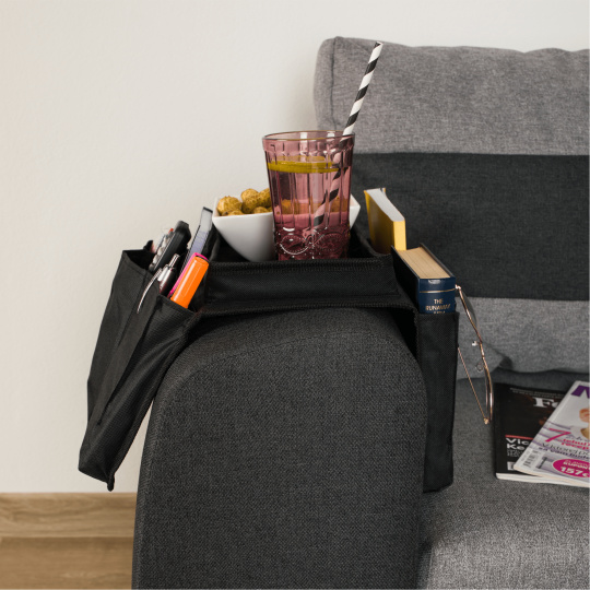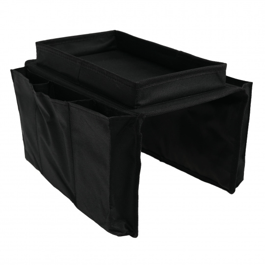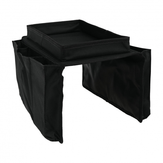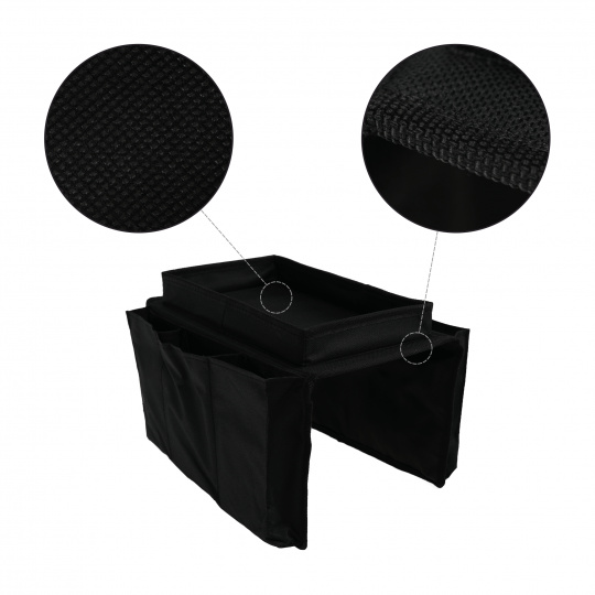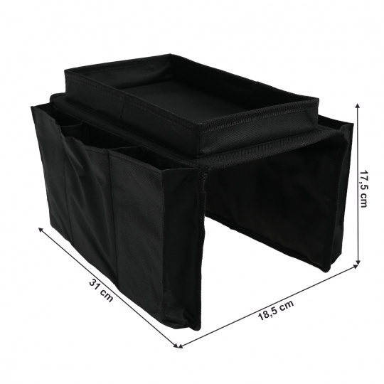 Materiál: 100% polyester Barva: černá Rozměry (ŠxH): 53x31 cm Šířka části s kapsou na tablet: 17,5 cm Šířka části s vrchní odkládací plochou: 18,5 cm Výška vrchní odkládací plochy: 4 cm Nosnost: 5 kg Na opěrky rukou na sedací soupravě, na pohovce, křesle Vhodná na opěrky s šířkou do 18 cm 1 velká kapsa 3 menší přihrádka Jednoduše se skládá a přemisťuje Doporučujeme pouze otřít vlhkým hadříkem Dodávané v monte