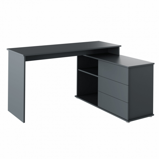 Materiál: DTD laminovaná Barva: grafit Rozměry (ŠxHxV): 138x50 / 110x75,4 cm Tloušťka materiálu: 16 mm univerzální 3 šuplíky otevřená police Vhodný i do prostoru Z boku čielok zásuvek je přesah Kvalitní slovenský výrobek Dodávané v demontu